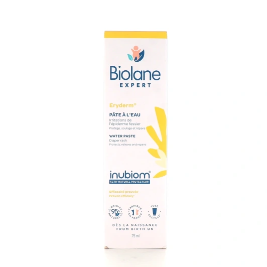 La pâte à l'eau Eryderm proposée par la marque Biolane Expert est une préparation traditionnelle à base d'oxyde de zinc (25 %). Elle vise à soulager et réparer les rougeurs et irritations légères à sévères qui apparaissent sur les fesses de bébé à la suite d'un contact prolongé avec les selles et les urines, ou des frottements de la couche. Ainsi, c'est un soin qui peut être employé en cas d'érythème fessier.