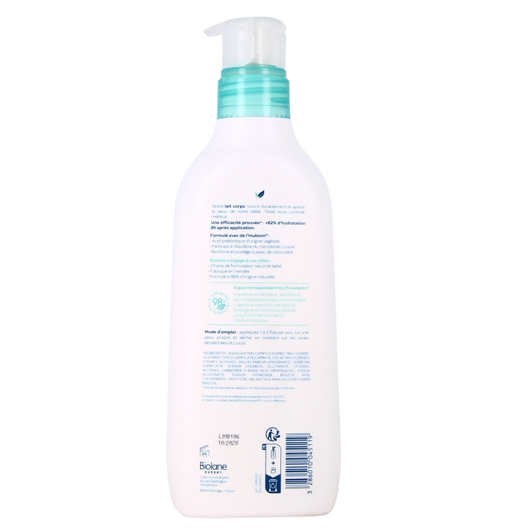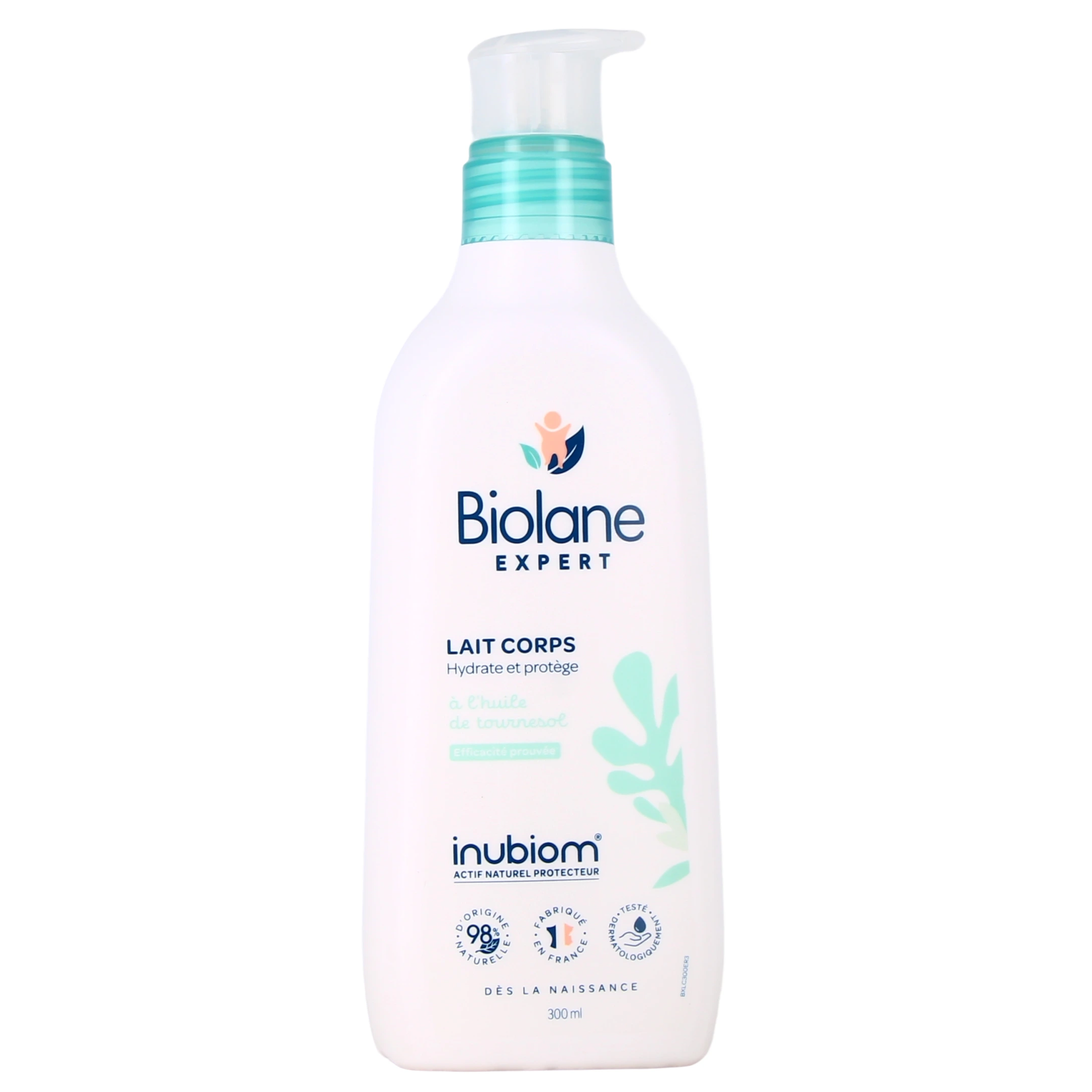 La formule du lait corps Biolane est enrichie en agents nourrissants, dont l'huile de tournesol, sources d'acides gras essentiels pour le maintien du confort cutanée et du film hydrolipidique. On retrouve aussi de la glycérine, aux propriétés humectantes, qui participe à une hydratation optimale. Enfin, l'Inubiom est un actif prébiotique d'origine végétale qui renforce le microbiome cutané et protège la peau de bébé.
