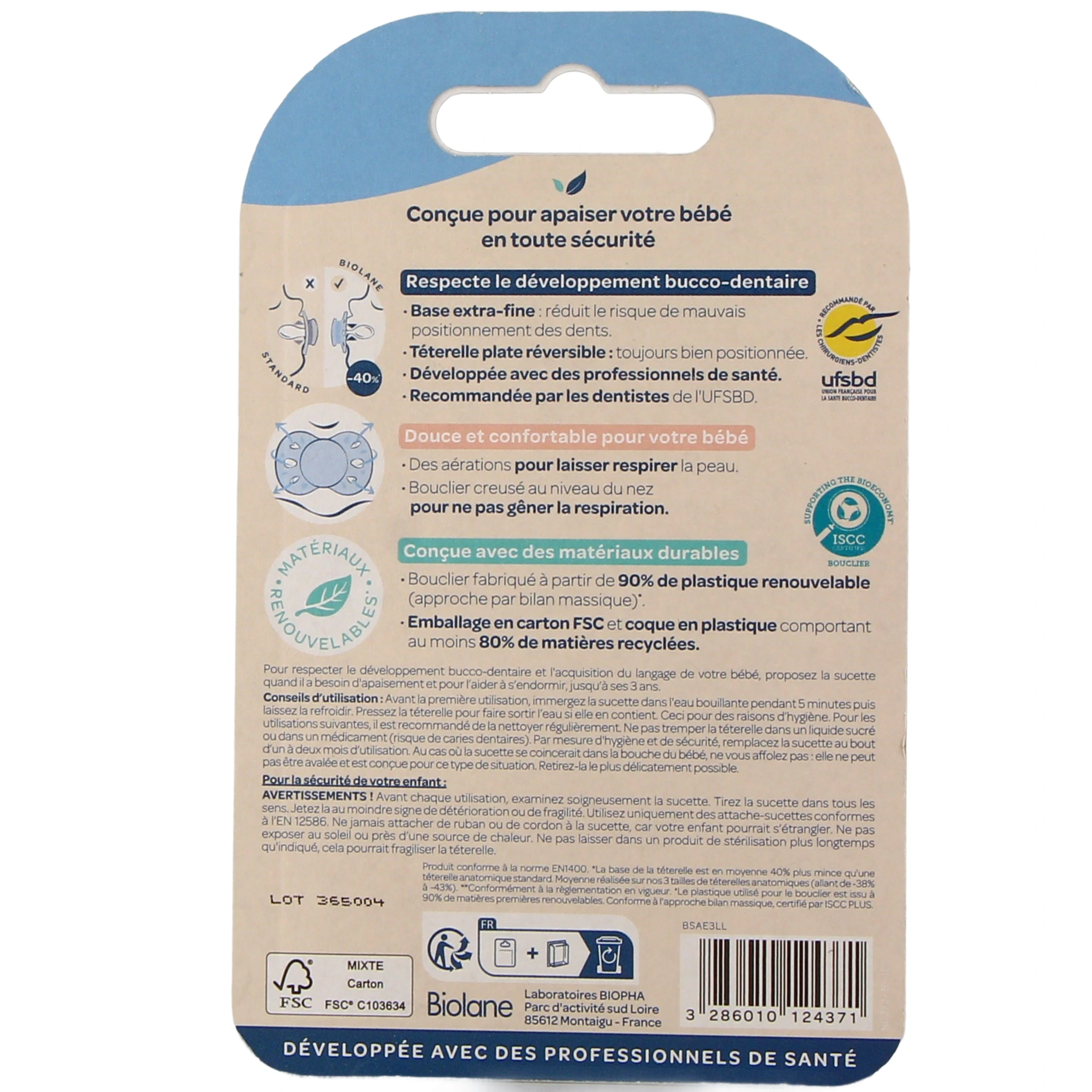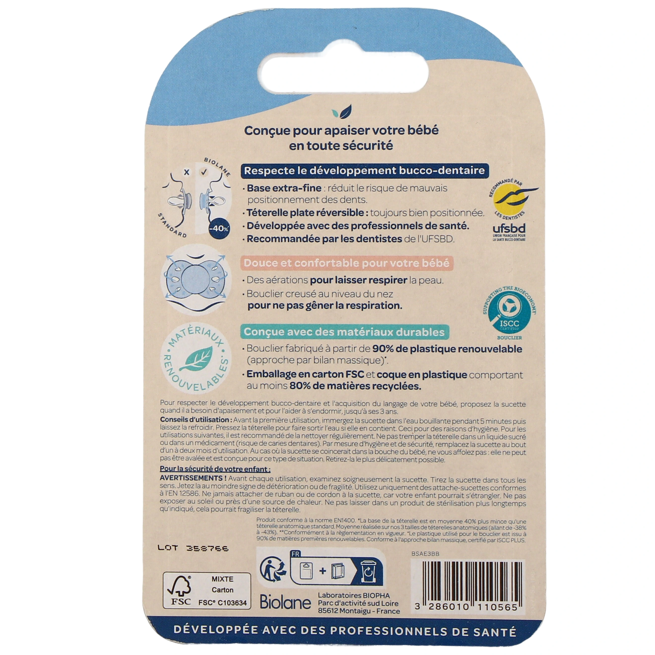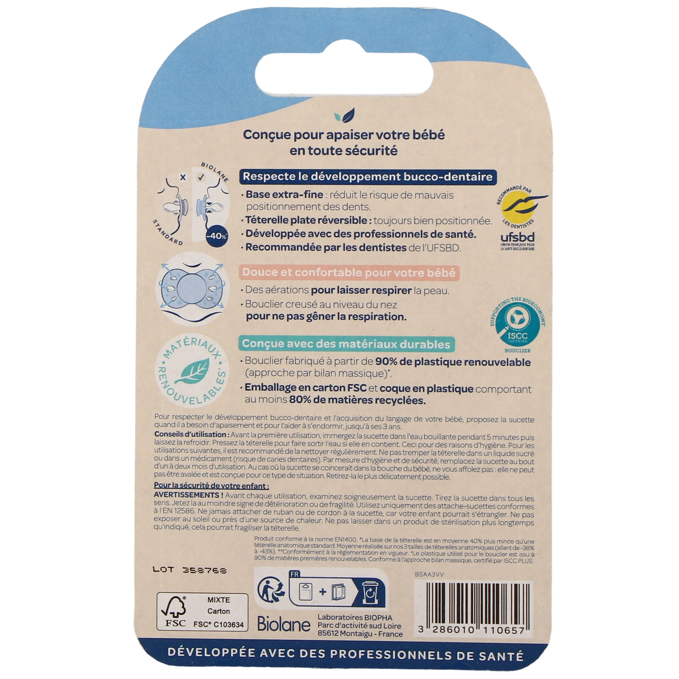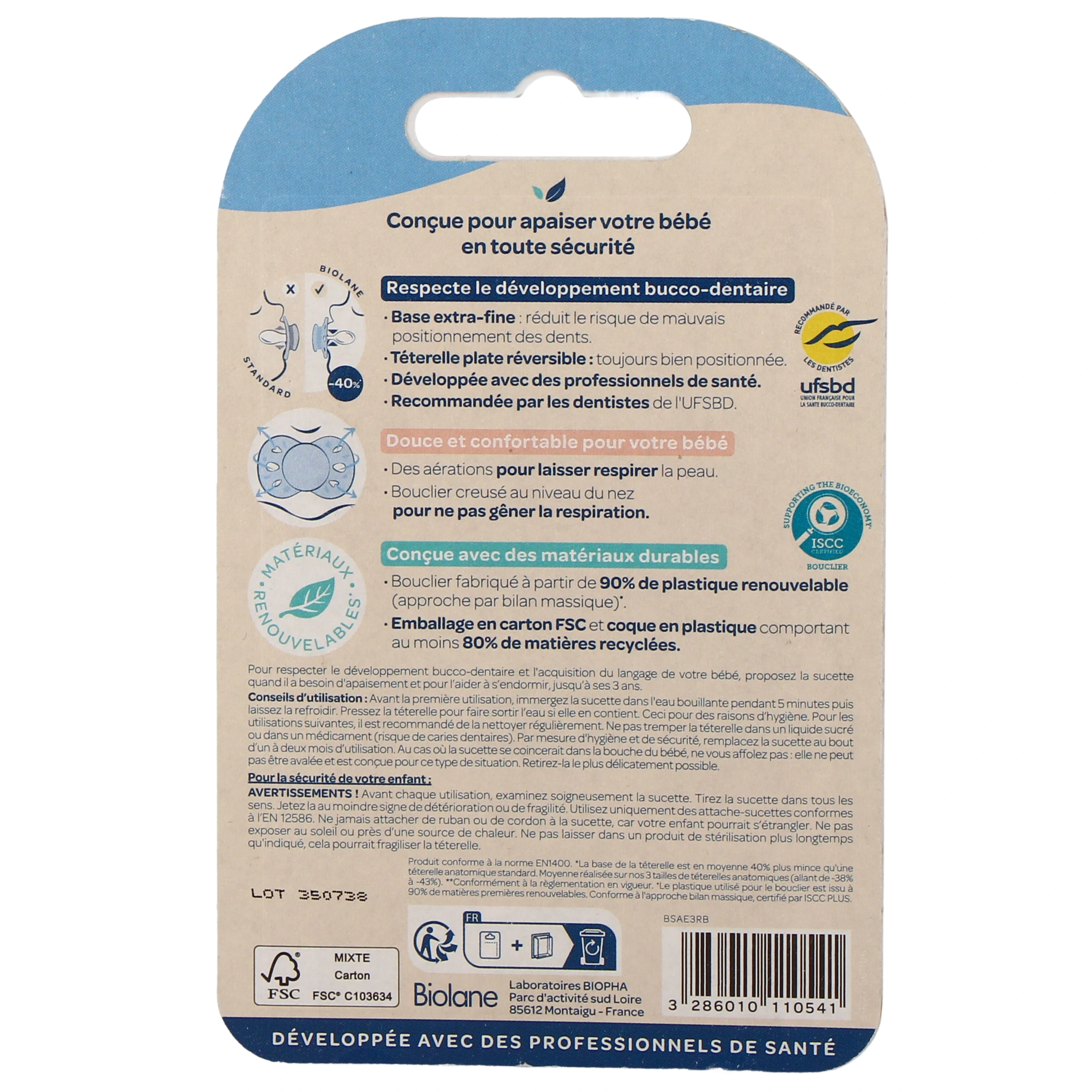 Les sucettes anatomiques +18 mois Biolane sont conçues pour apaiser bébé en toute sécurité tout en respectant son développement bucco-dentaire. Élaborées en collaboration avec des professionnels de santé et recommandées par l'UFSBD, elles disposent d'une base en silicone extra fine. Leur design ergonomique et leurs matériaux sains garantissent confort, durabilité et une excellente acceptation pour les enfants de plus de 18 mois.