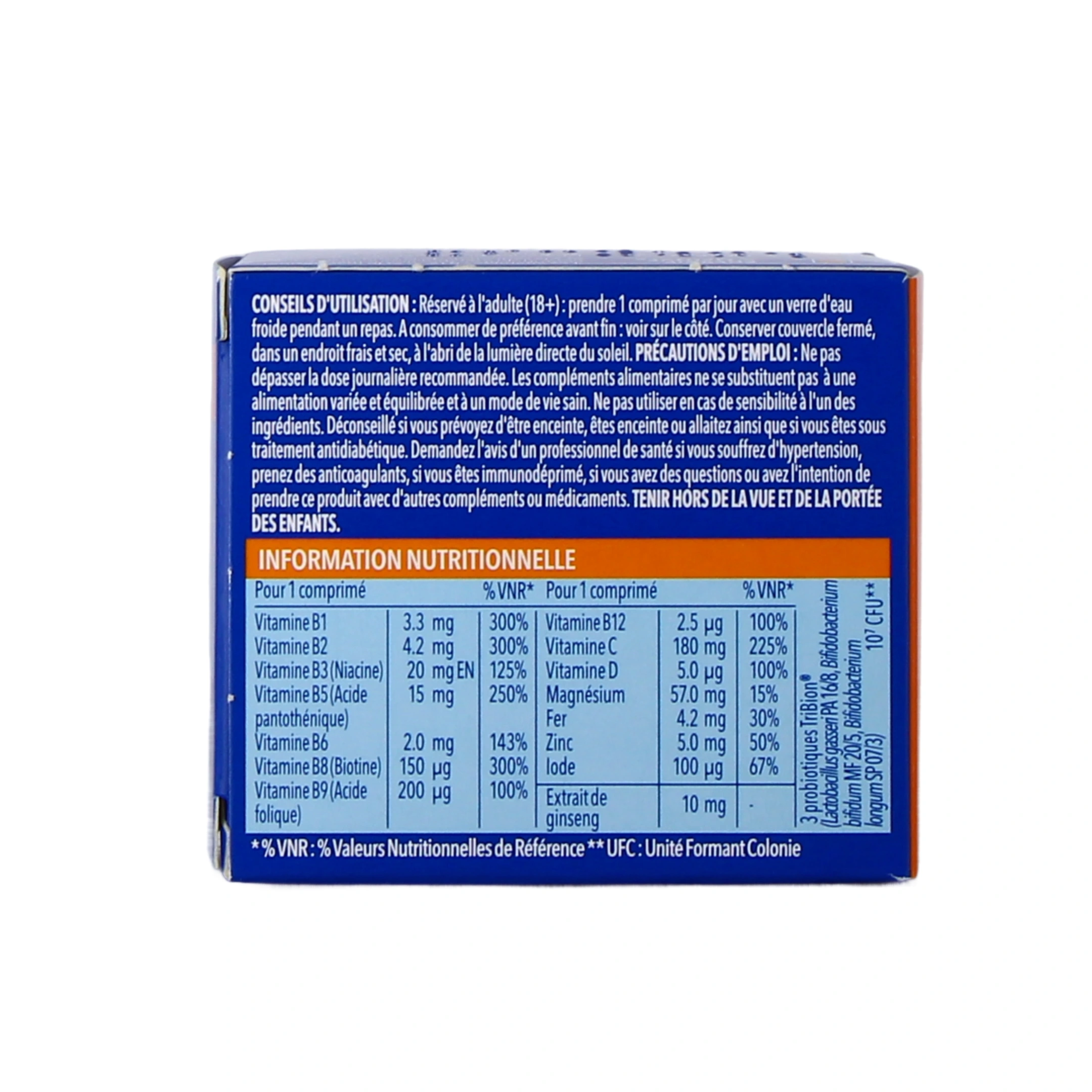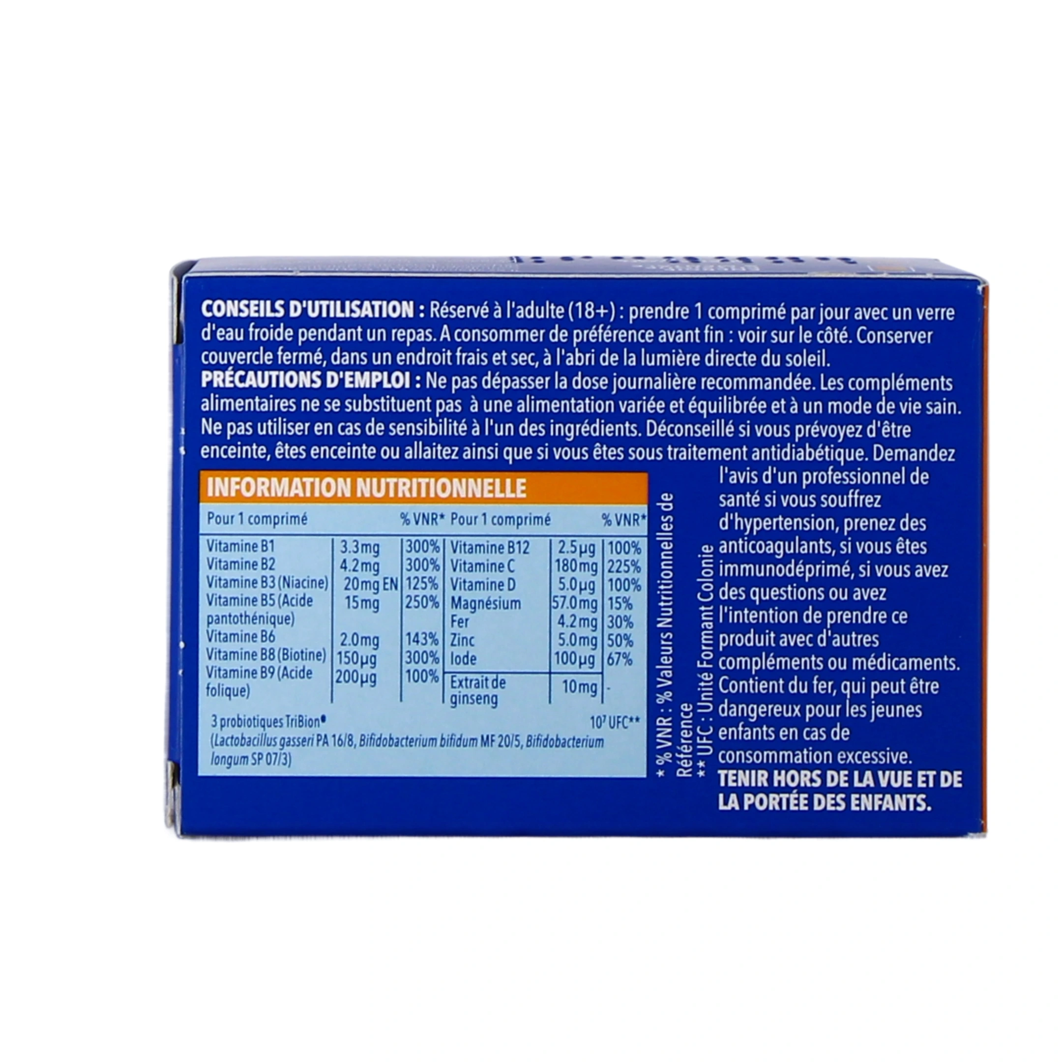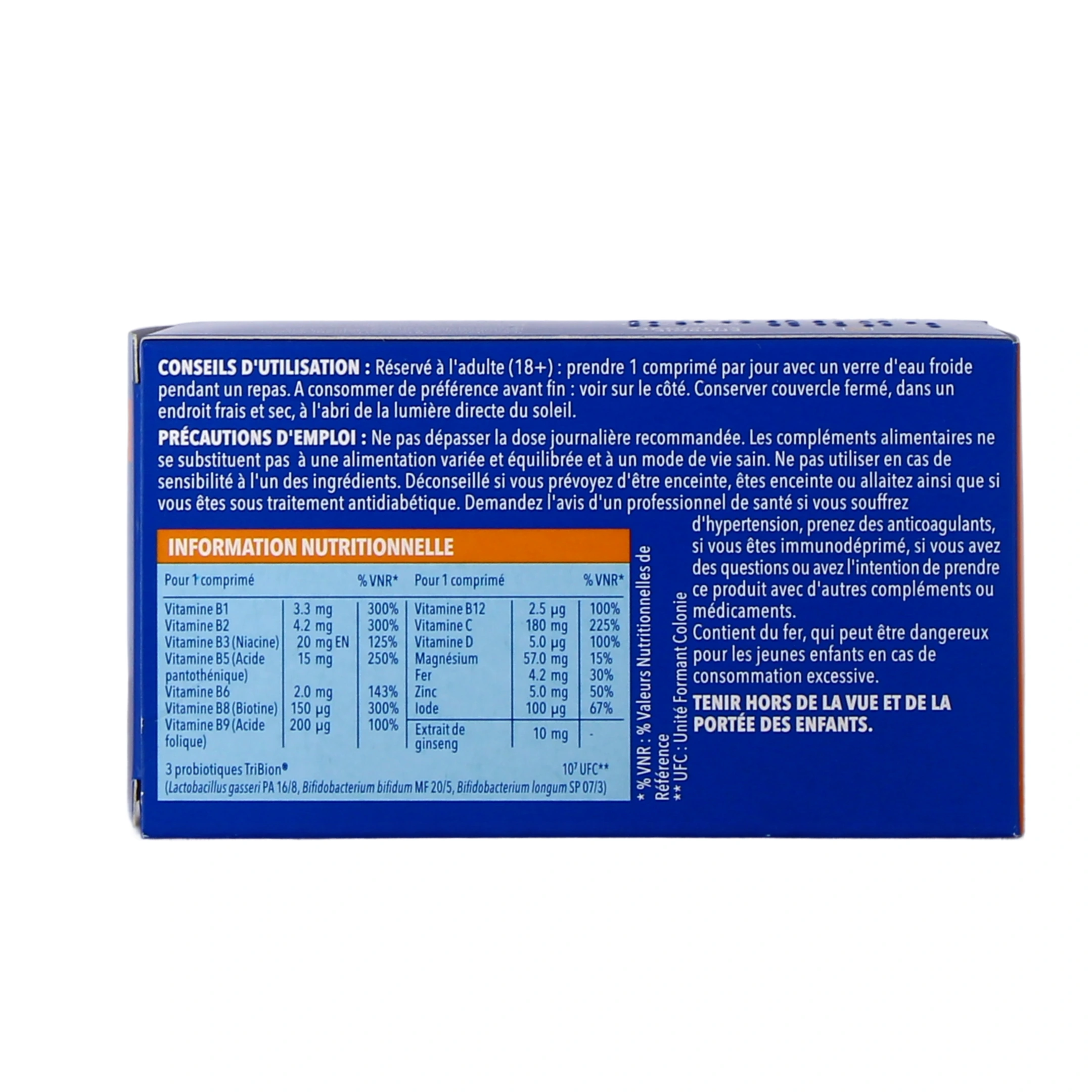 Bion 3 Énergie renferme 10 vitamines, 4 sels minéraux ainsi que 3 souches microbiotiques brevetées :