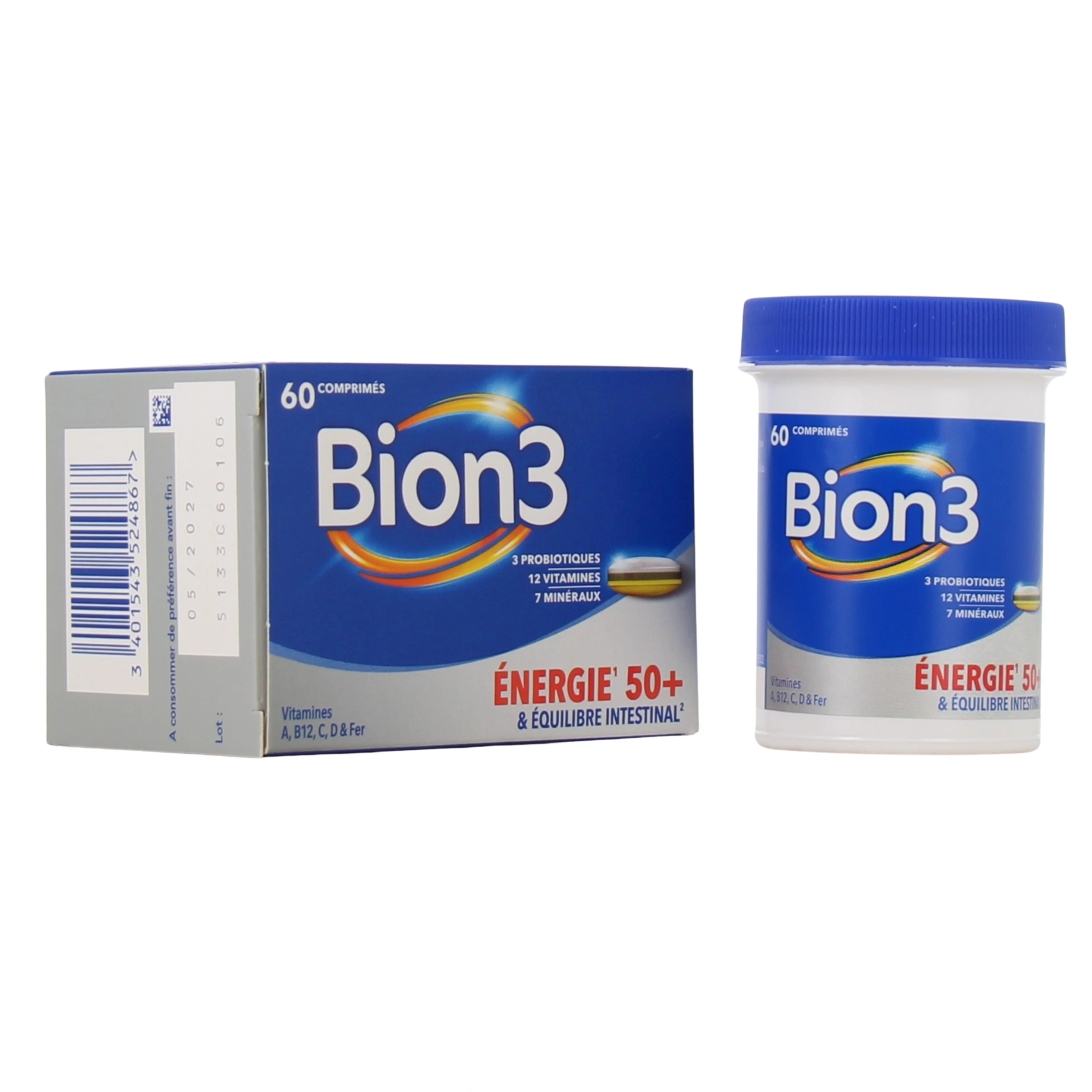 Bion3 Vitalité 50+ est un complément alimentaire qui contribue à l'énergie et à l'équilibre intestinal chez le senior.