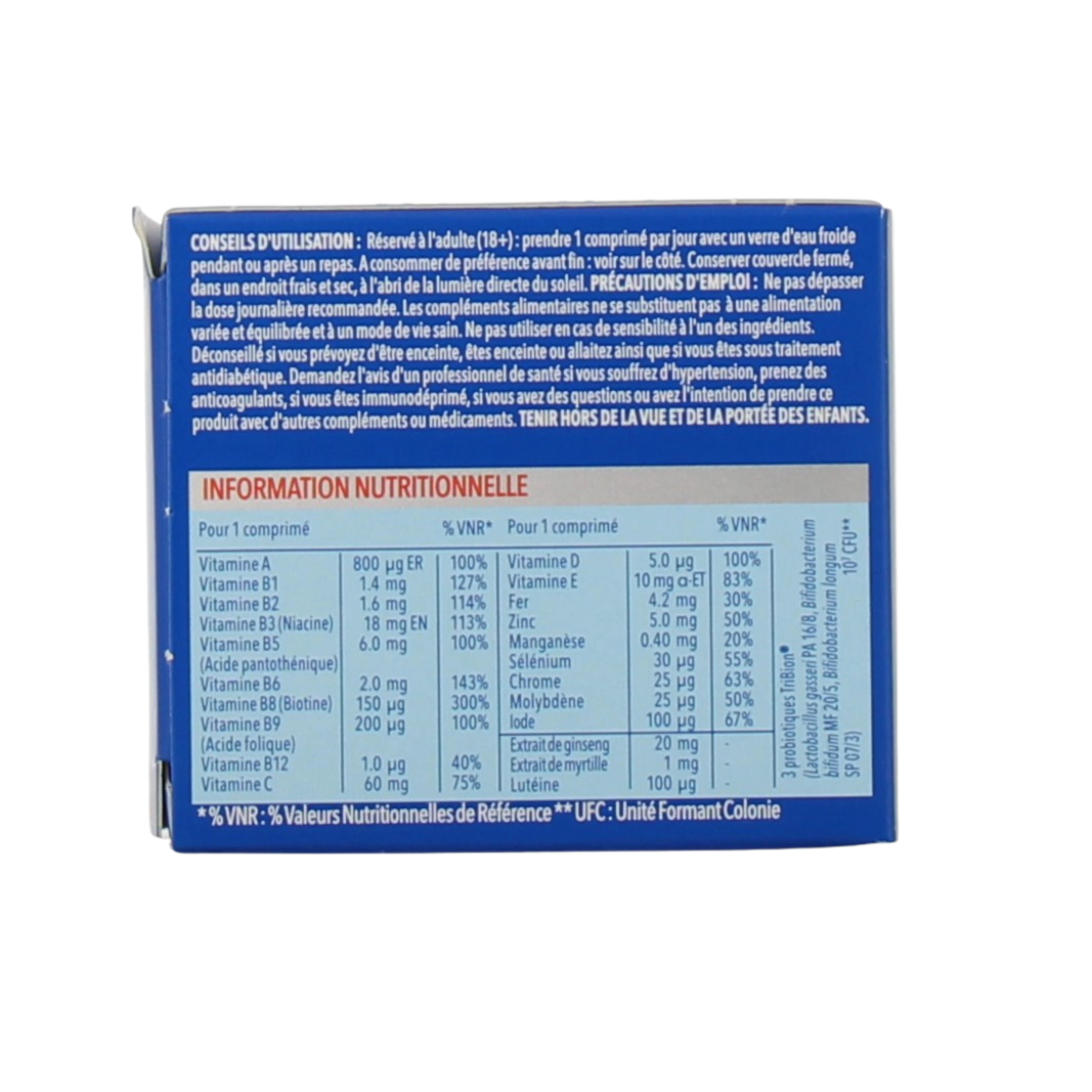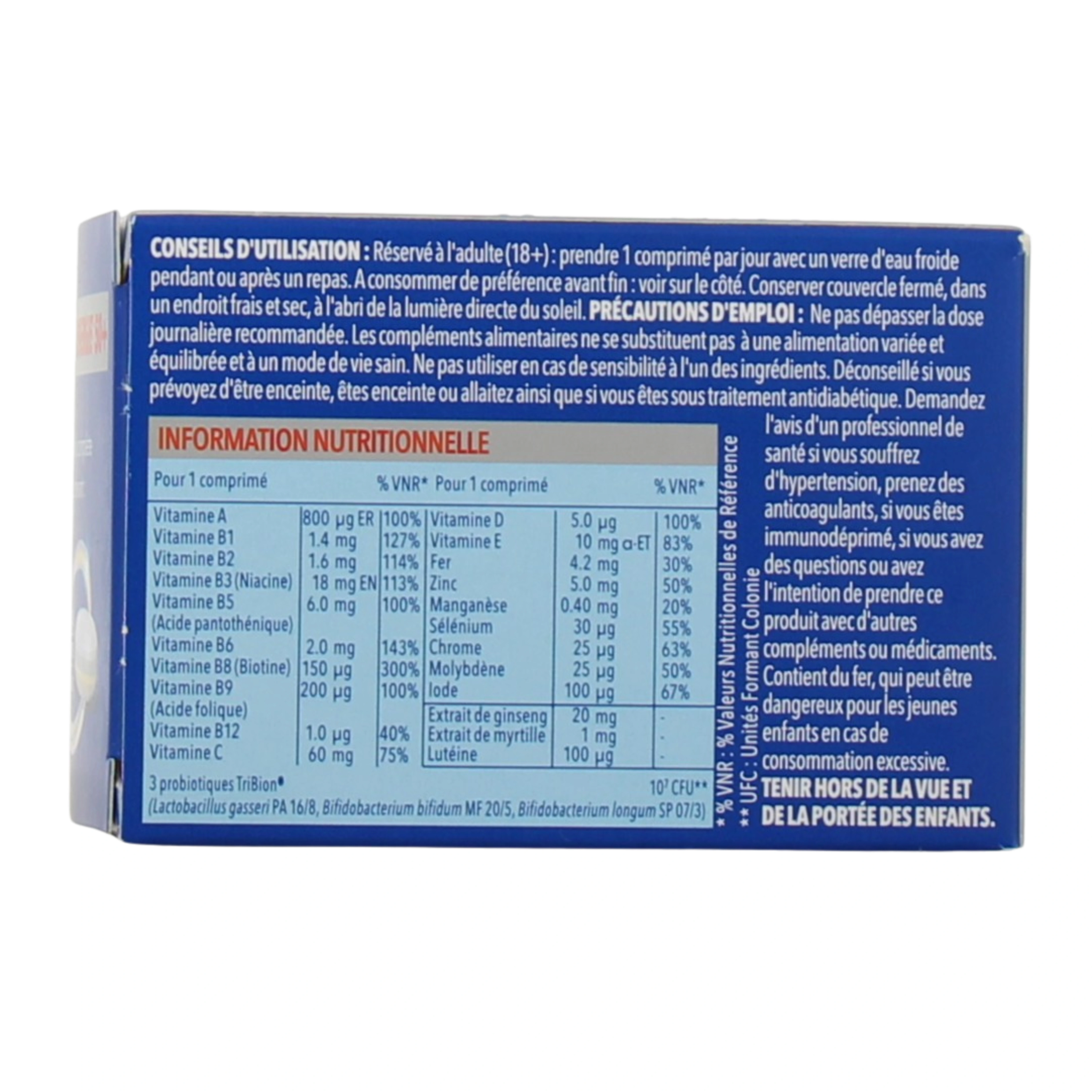 Bion3 Énergie 50+ est une formule complète à base de 12 Vitamines, 7 Minéraux, 3 souches probiotiques Bion exclusifs. Grâce à son association unique de ferments microbiotiques, de vitamines, de minéraux complétés de ginseng et de lutéine, Bion3 Énergie 50+ vous permet d’activer votre vitalité et votre énergie pour profiter pleinement de vos activités quotidiennes, notamment grâce à la vitamine D et au zinc. De plus, Bion 3 Vitalité 50+ agit sur :