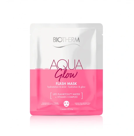 Conditionnement disponible sur votre pharmacie en ligne : sachet de 1 masque en tissu Biotherm Aqua Glow Flash Mask.