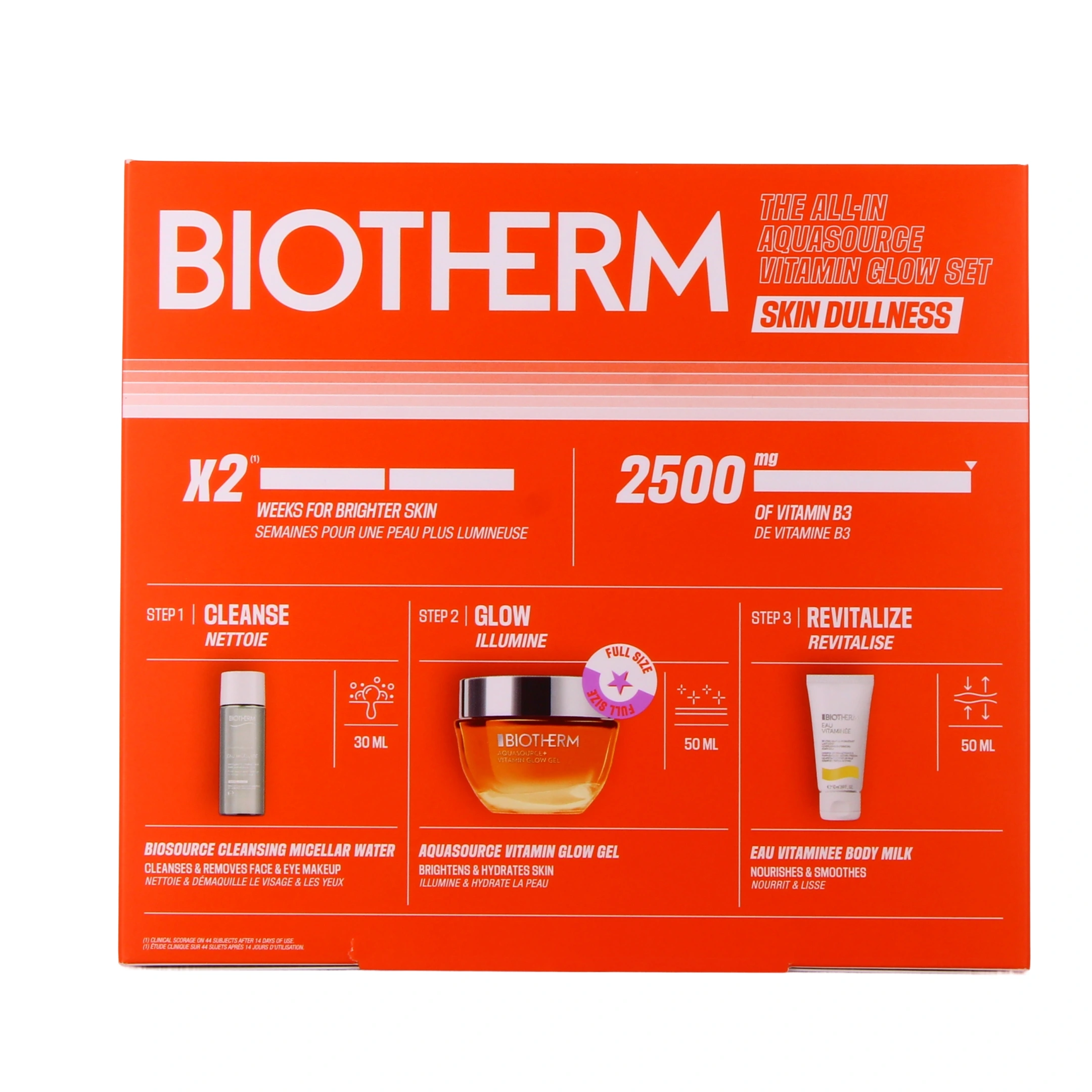 La formule du gel Aquasource Vitamin Glow Biotherm a été pensée pour hydrater la peau et illuminer le teint. Elle uniformise le grain de peau, estompant les petites irrégularités pigmentaires, et contribue à renforcer la barrière cutanée. Ce gel hydratant éclat contient notamment 2 ingrédients clés :