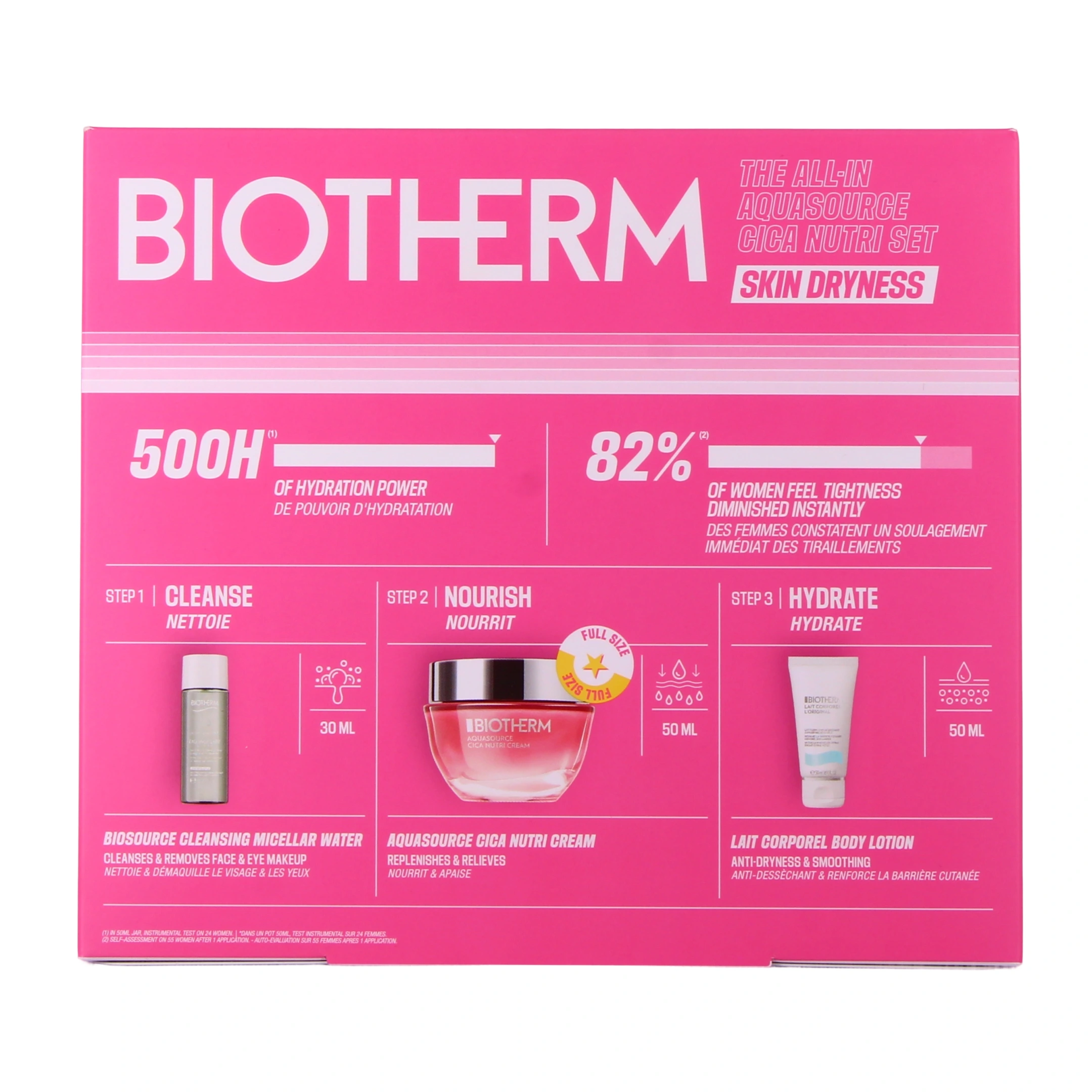 Ce coffret Biotherm abrite 3 soins visage Biotherm répondant aux besoins quotidiens des peaux sèches. On retrouve tout d'abord l'eau micellaire Biosource, une solution nettoyante et démaquillante qui s'utilise au quotidien sur tous les types de peau. Elle procure une véritable sensation de fraîcheur et de pureté.