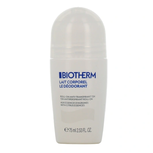 Le déodorant roll-on Lait Corporel Biotherm est un déodorant à bille anti-transpirant enrichi aux essences d'agrumes. Ce déodorant roll-on s'adapte à tous les types de peaux et contrôle le processus de transpiration en resserrant les pores de la peau. Ce déodorant anti-transpirant à bille Biotherm offre une efficacité anti-traces et anti-odeurs jusqu'à 48 heures.