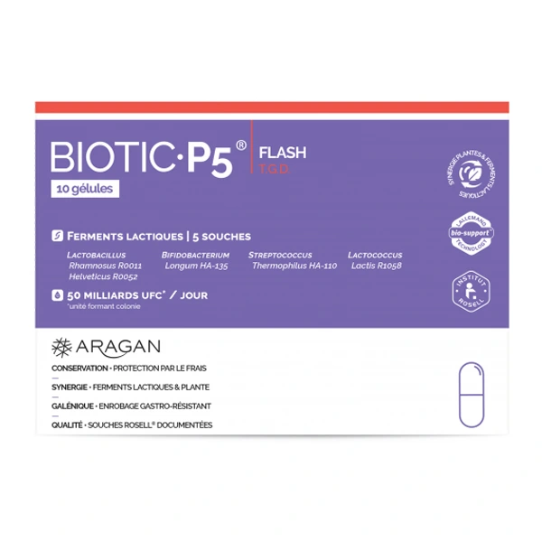 Complément alimentaire à base de ferments lactiques pour le transit intestinal, apportant 50 milliards de ferments lactiques par jour, issus de 5 souches différentes.