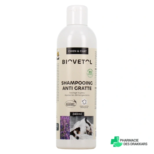 Présentation disponible pour le shampooing anti-gratte Bio Biovetol sur notre pharmacie en ligne : flacon de 240 ml. Vous pourriez également préférer la lotion anti-gratte Bio de Biovetol.