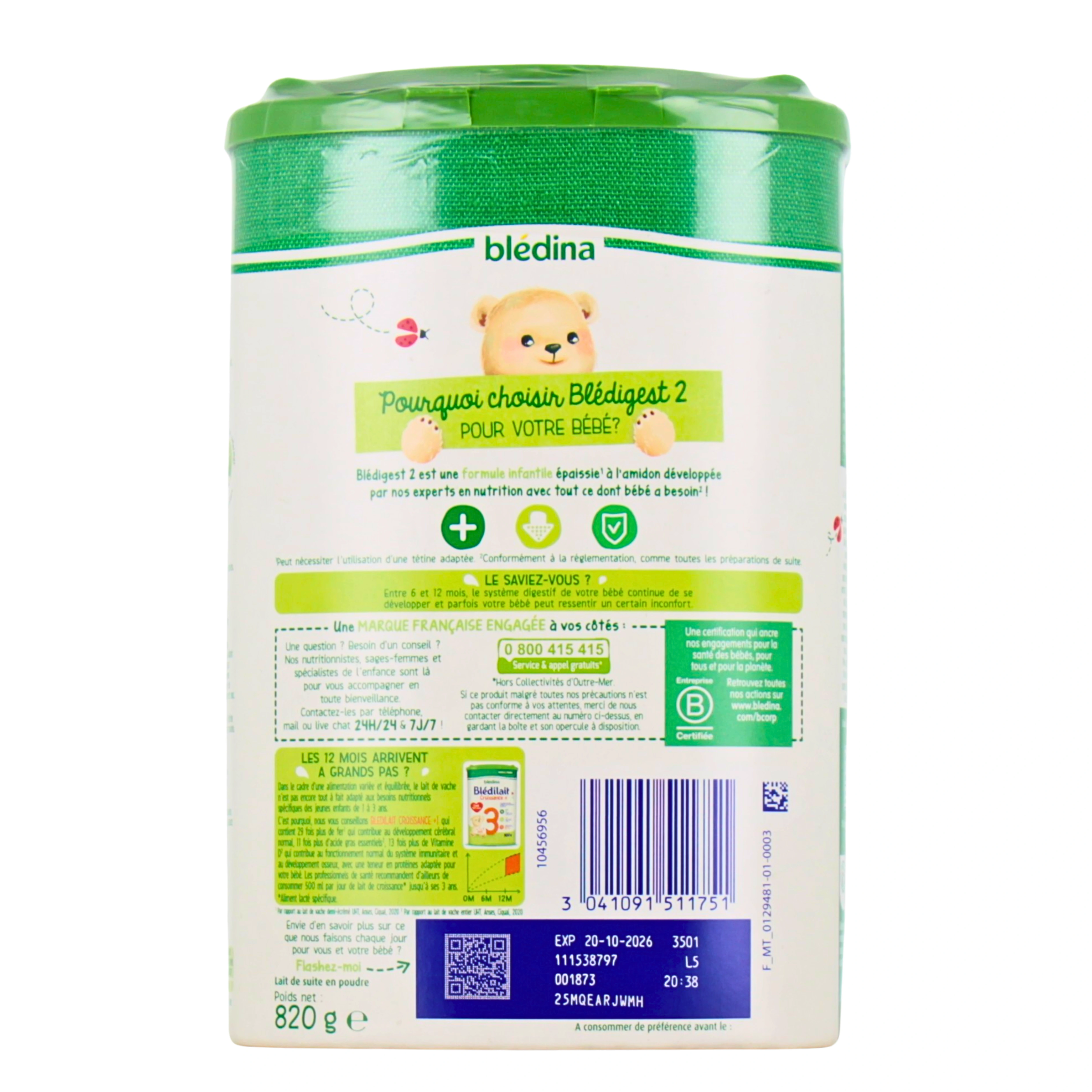 La formule épaissie à l'amidon du lait 2ème âge Blédigest contient des fibres, des FOS et GOS, des oméga 3 ainsi que des vitamines A, C et D, qui contribuent au bon fonctionnement du système immunitaire de bébé.