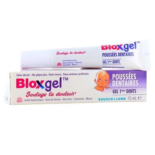 Bloxgel Poussées Dentaires est le tout nouveau gel spécial premières dents conçu par le laboratoire Bausch & Lomb. Il s'utilise facilement, en déposant une petite quantité de Bloxgel sur les gencives de bébé, et en les massant ensuite délicatement avec.