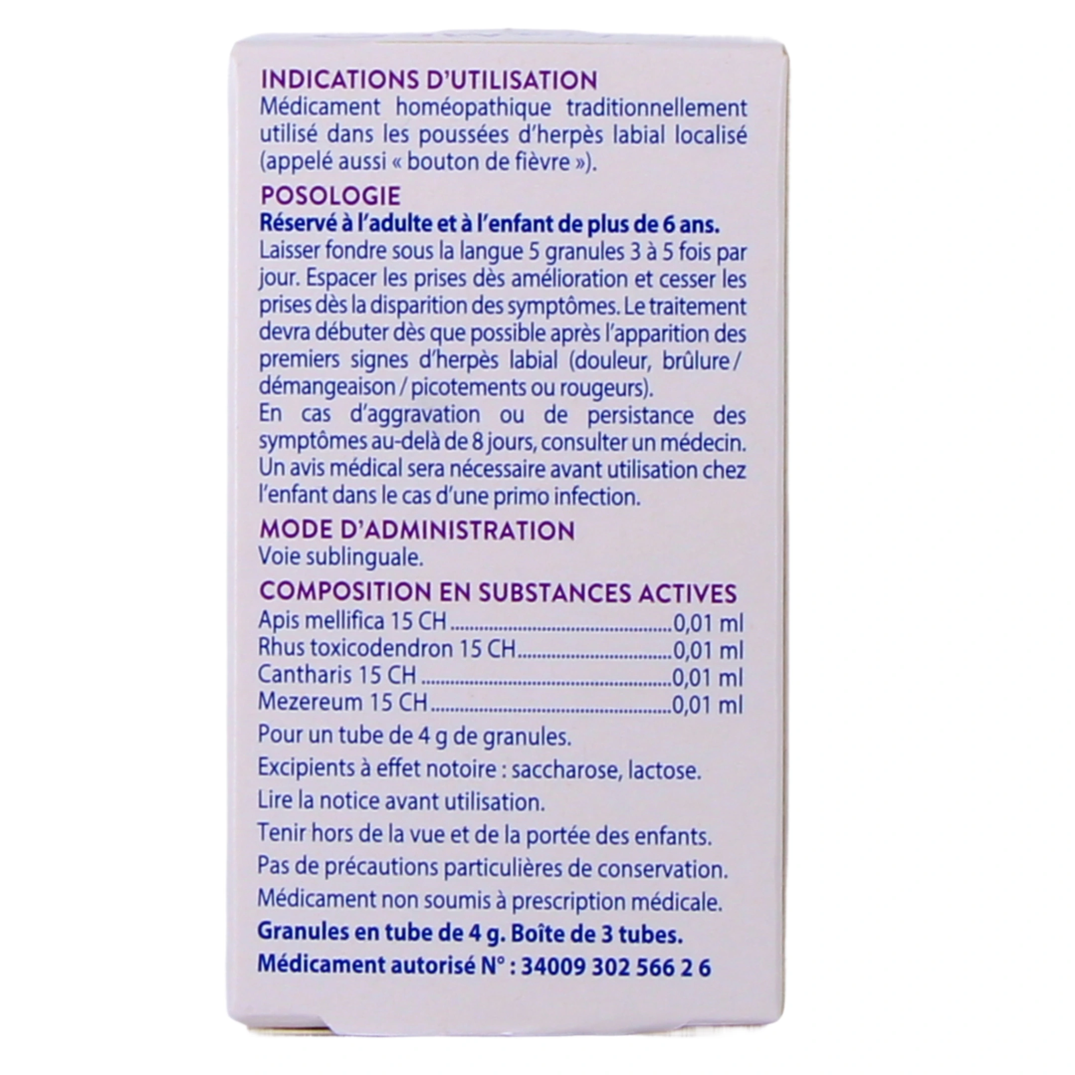 La prise des granules de Labiameo Herpès Labial de Boiron est à débuter dès possible suite à l'apparition des premiers signes d'herpès labial (brûlure, démangeaisons, douleur, picotements ou encore rougeurs).