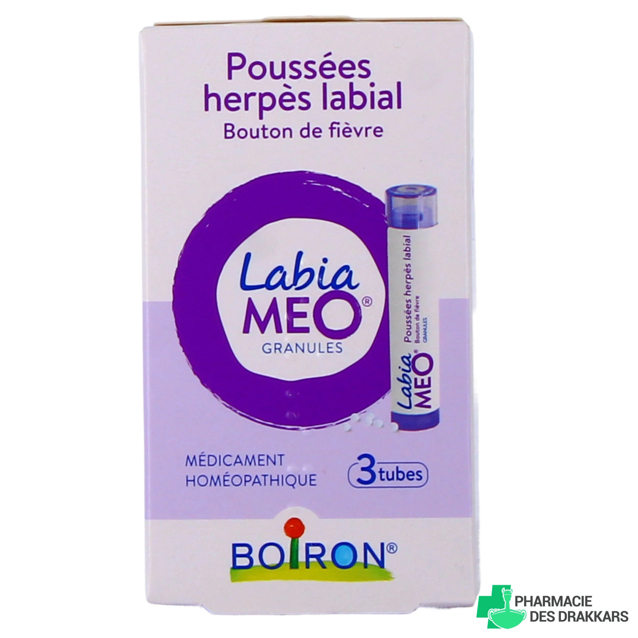Labiameo Herpès Labial des laboratoires homéopathiques Boiron est un médicament homéopathique sous forme de granules en tube, traditionnellement indiqué en cas de poussée d'herpès labial, chez l'adulte et l'enfant de plus de 6 ans.