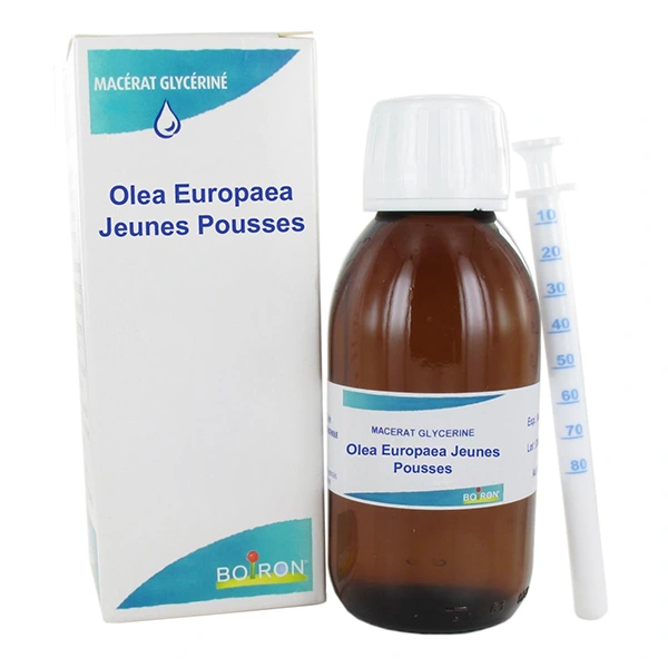 Le Macérat glycériné Olea Europaea formulé par le Laboratoire Boiron est un médicament homéopathique qui suit sensiblement le même procédé de fabrication que celui des teintures-mères de la pharmacopée française Les différences se font quant au mélange utilisé pour la macération de l’extrait sec de plante, qui contient de la glycérine en plus de l’éthanol, mais aussi au niveau de la macération-mère en elle-même qui s’effectue au 1/20e d’un équivalent poids sec de bourgeons ou de jeunes pousses (contre 1/10e pour une teinture mère).