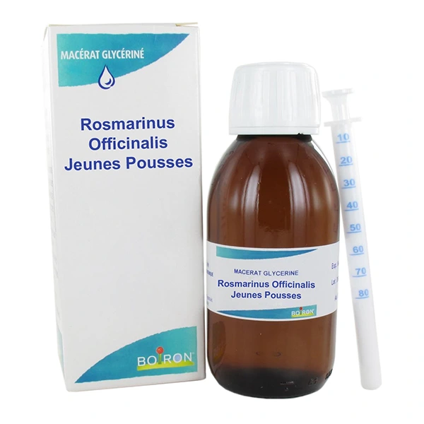 Le Macérat glycériné Rosmarinus officinalis formulé par le Laboratoire Boiron est un médicament homéopathique qui suit sensiblement le même procédé de fabrication que celui des teintures-mères de la pharmacopée française Les différences se font quant au mélange utilisé pour la macération de l’extrait sec de plante, qui contient de la glycérine en plus de l’éthanol, mais aussi au niveau de la macération-mère en elle-même qui s’effectue au 1/20e d’un équivalent poids sec de bourgeons ou de jeunes pousses (contre 1/10e pour une teinture mère).