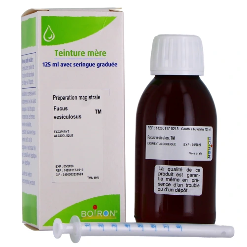 Les Teintures mères de la gamme Boiron sont des solutions homéopathiques qui ont la particularité de pouvoir être utilisées dans le traitement de différentes affections, les indications et les posologies étant déterminées par un professionnel de santé. Cette teinture-mère a pour substance active le Fucus Vesiculosus, et sa composition est complétée par une autre substance à effet notoire avec l’alcool.