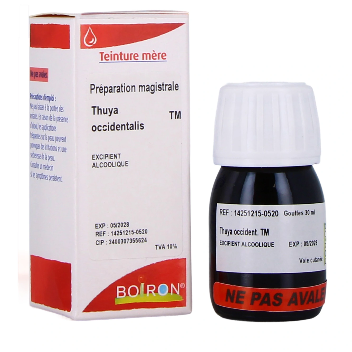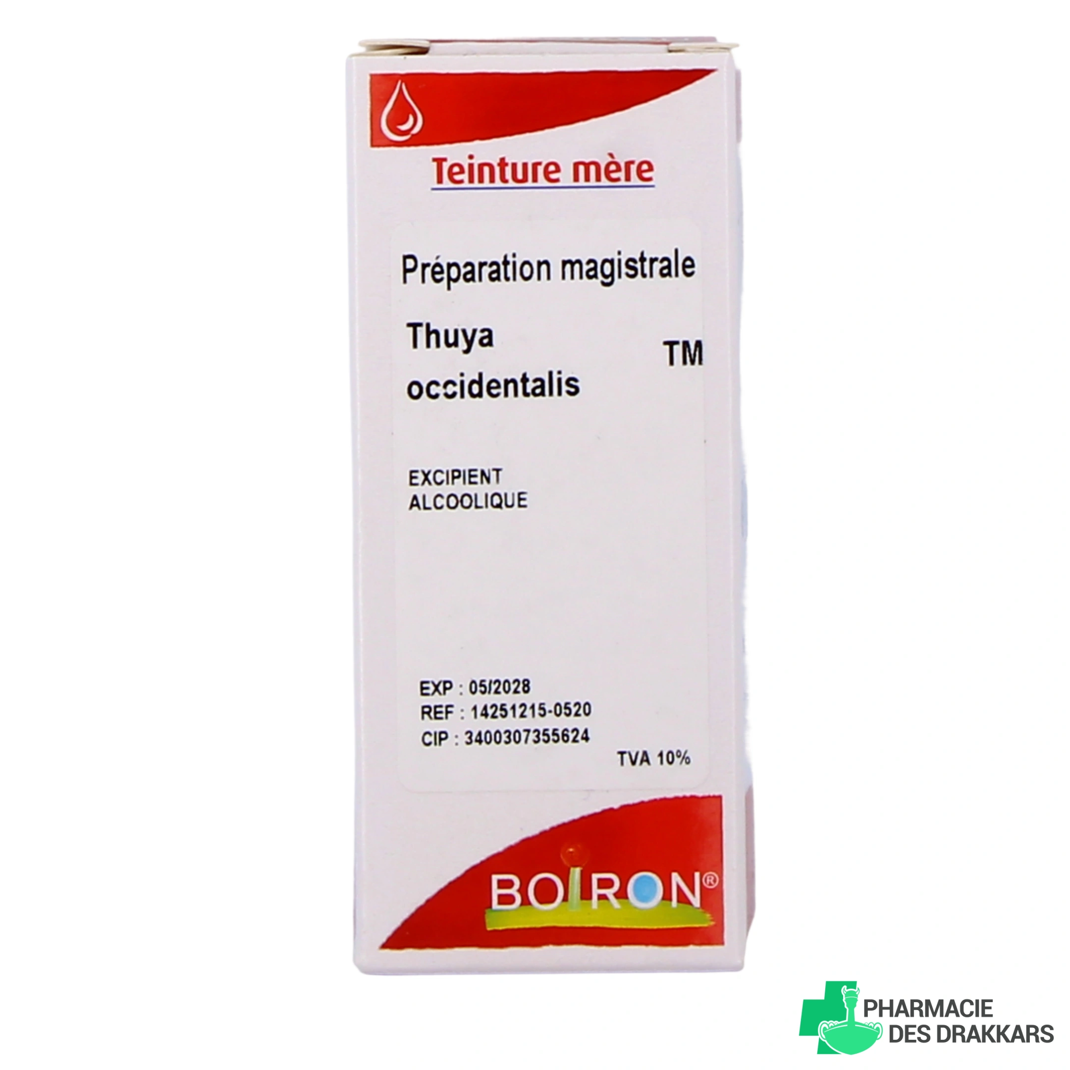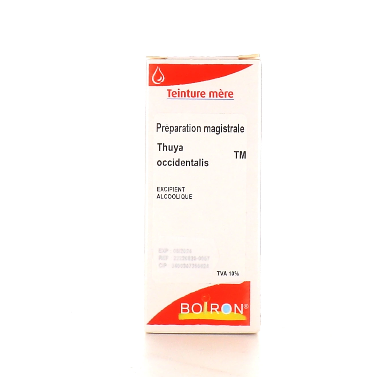 Les Teintures mères de la gamme Boiron sont des solutions homéopathiques qui ont la particularité de pouvoir être utilisées dans le traitement de différentes affections, les indications et les posologies étant déterminées par un professionnel de santé. Cette teinture-mère a pour substance active Thuya occidenalis, et sa composition est complétée par une autre substance à effet notoire avec l’alcool.