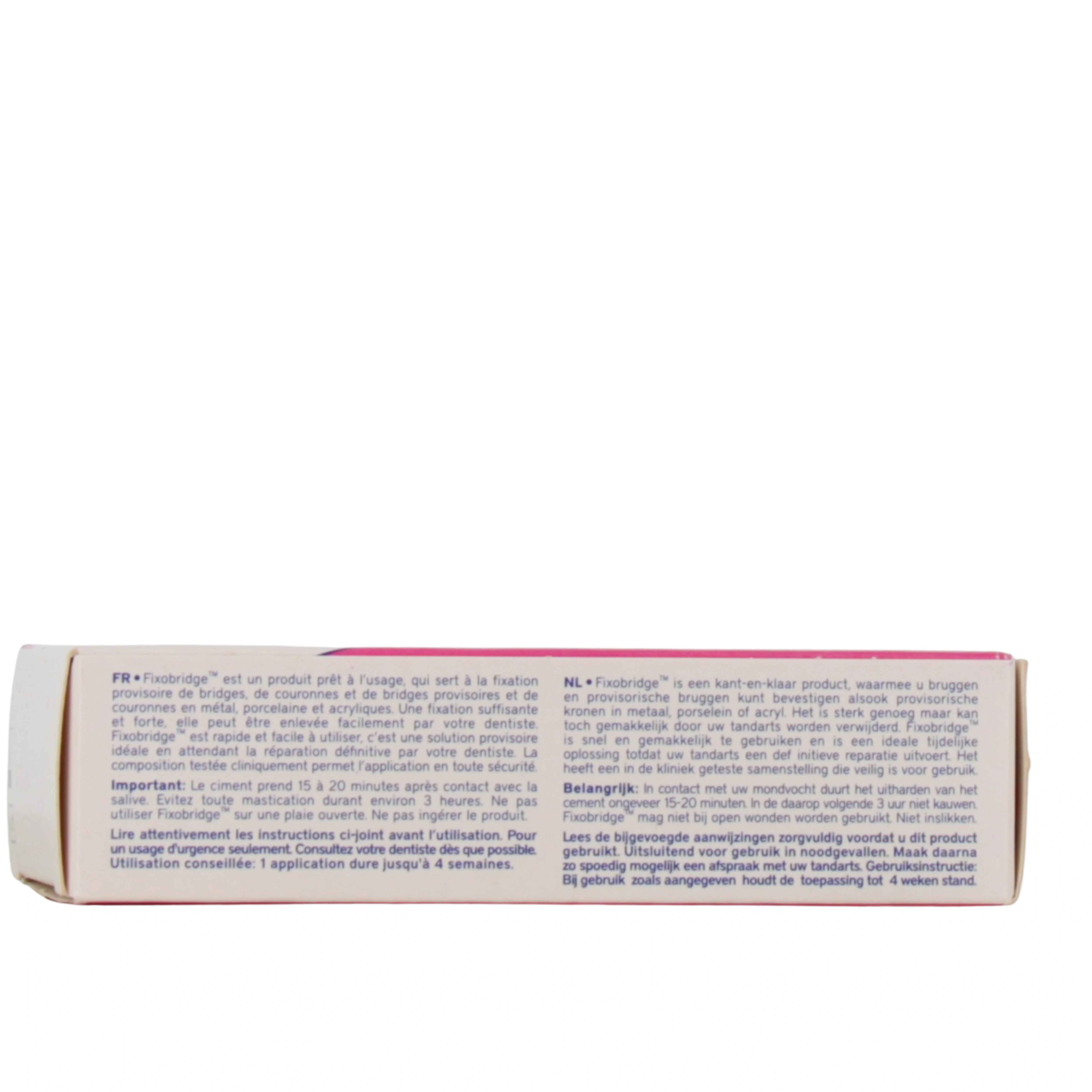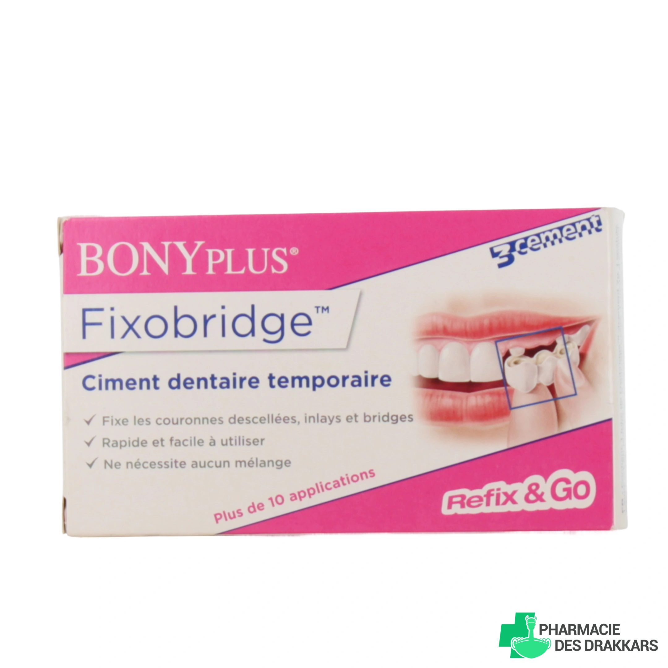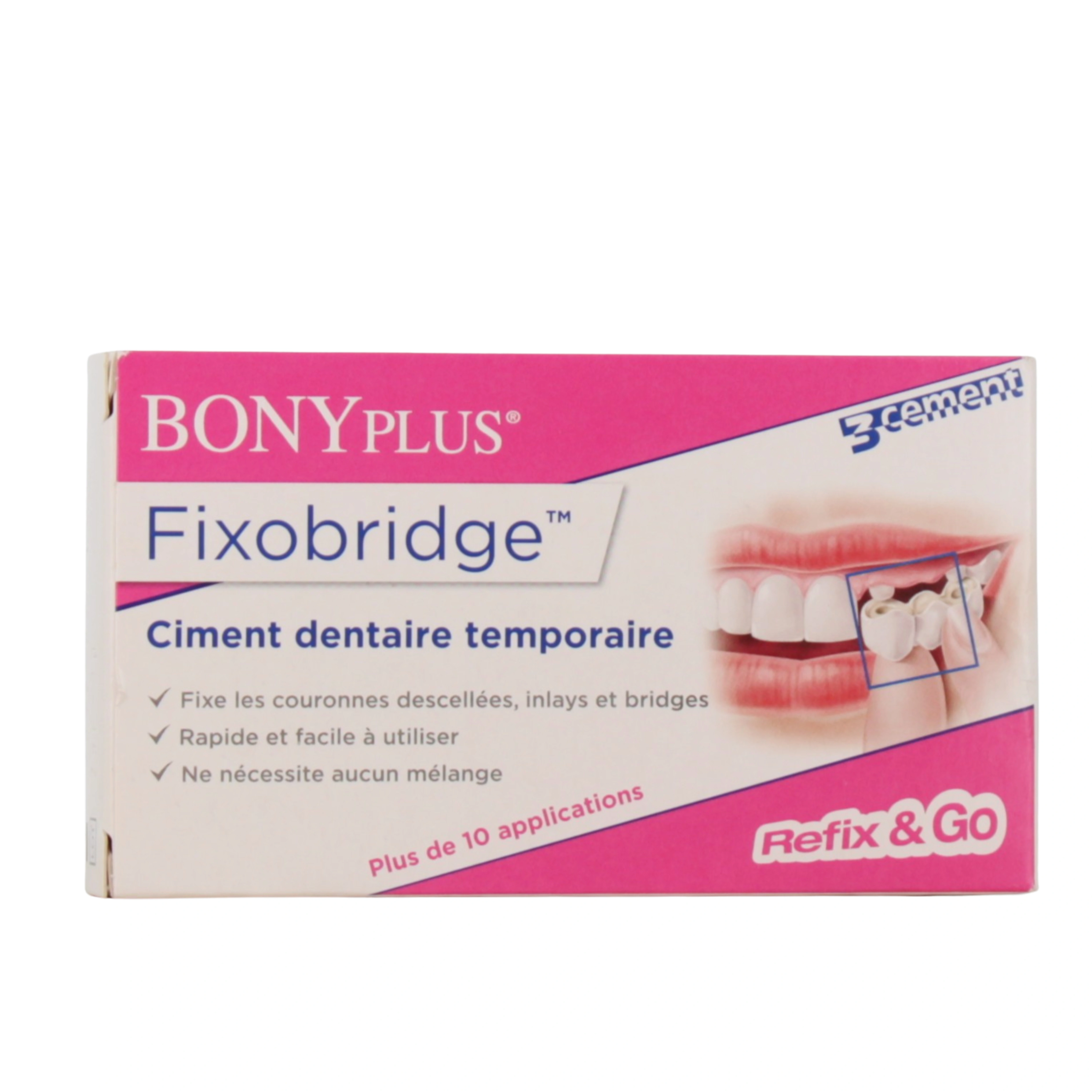 Bonyplus Fixobridge Ciment Dentaire Temporaire est un kit conçu pour fixer une couronne, un inlay ou un bridge qui s'est détaché, en attendant de bénéficier d'une réparation permanente chez le dentiste.