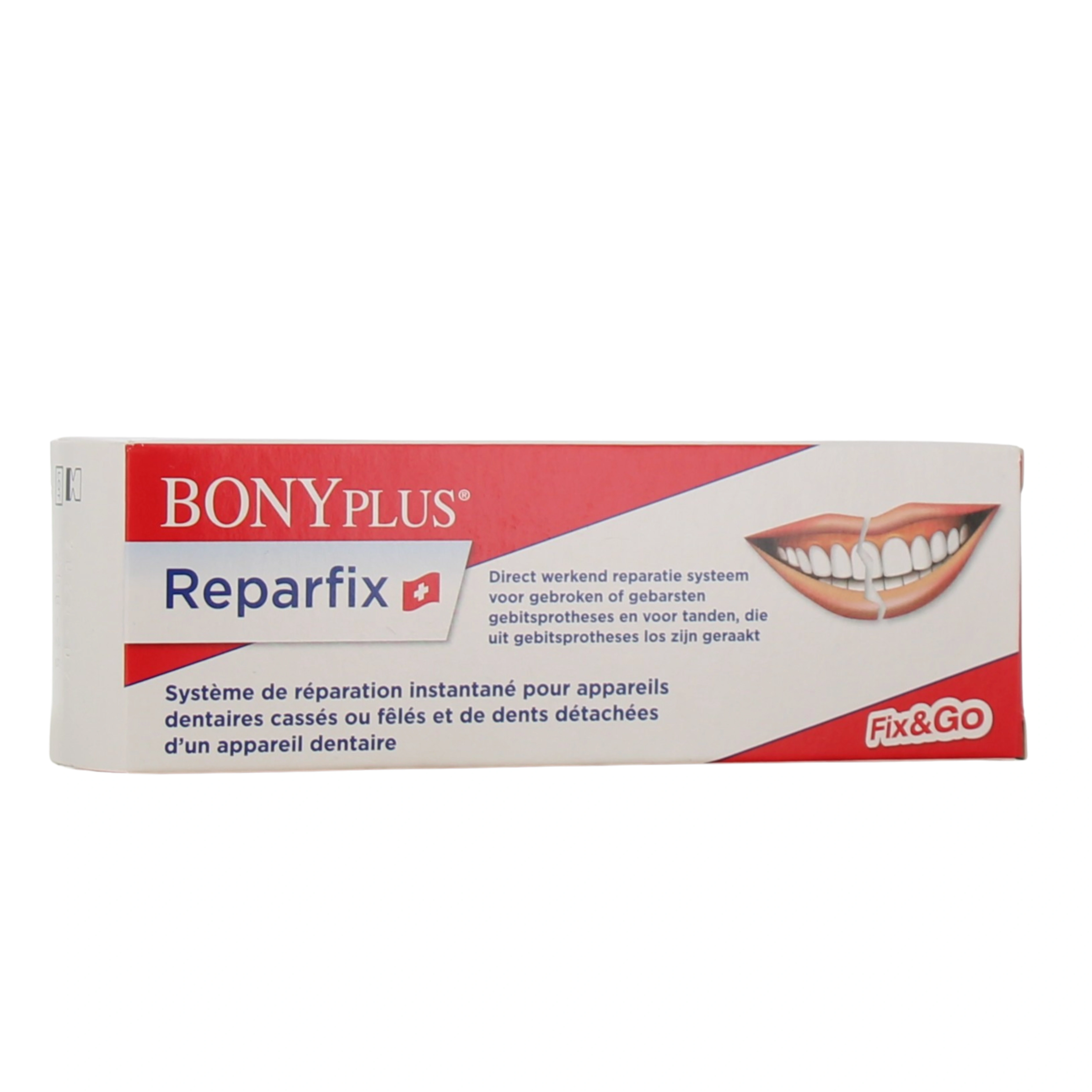 Bonyplus Reparfix est un système de réparation instantanée pour les prothèses dentaires cassées ou fêlées, convenant également pour les dents détachées des prothèses dentaires.