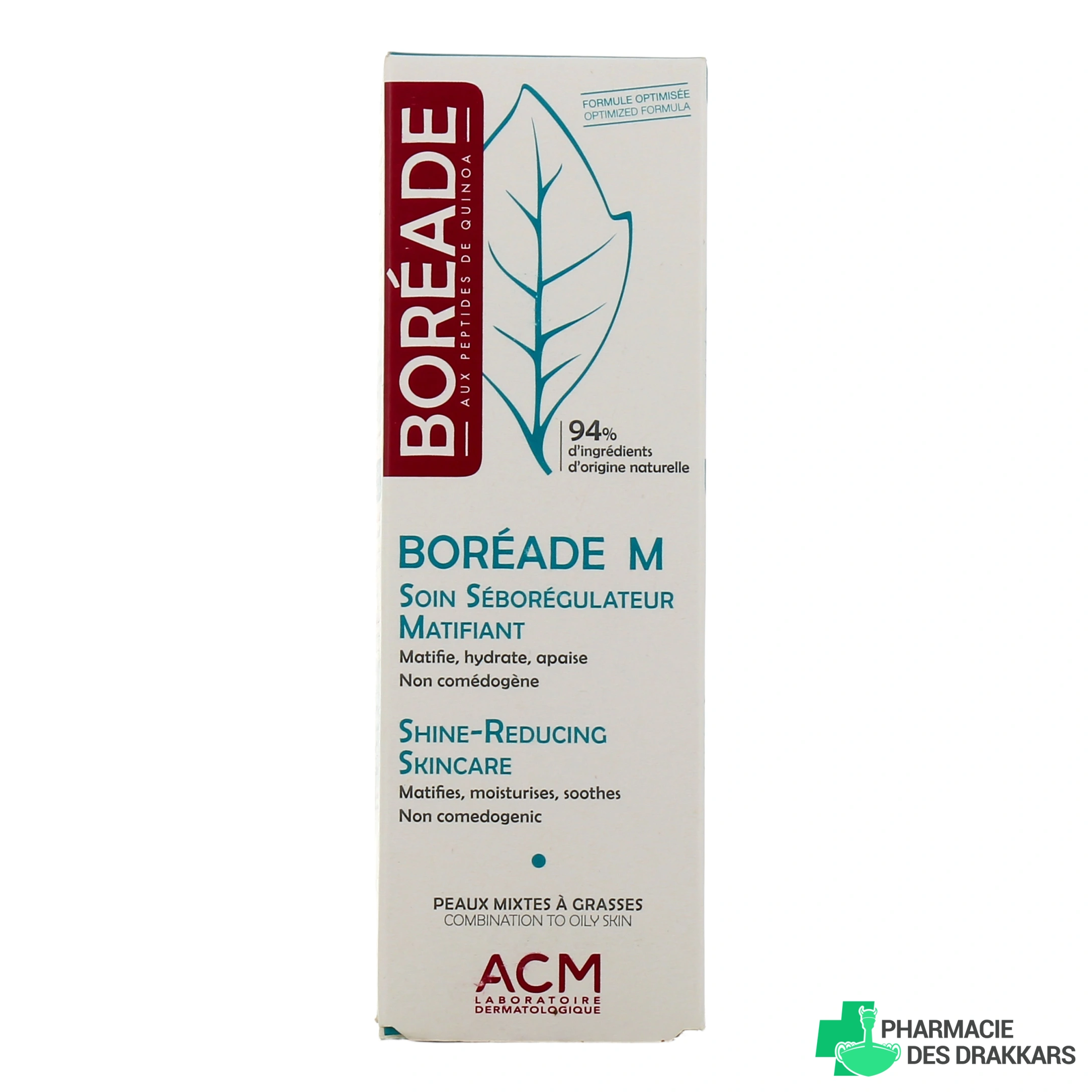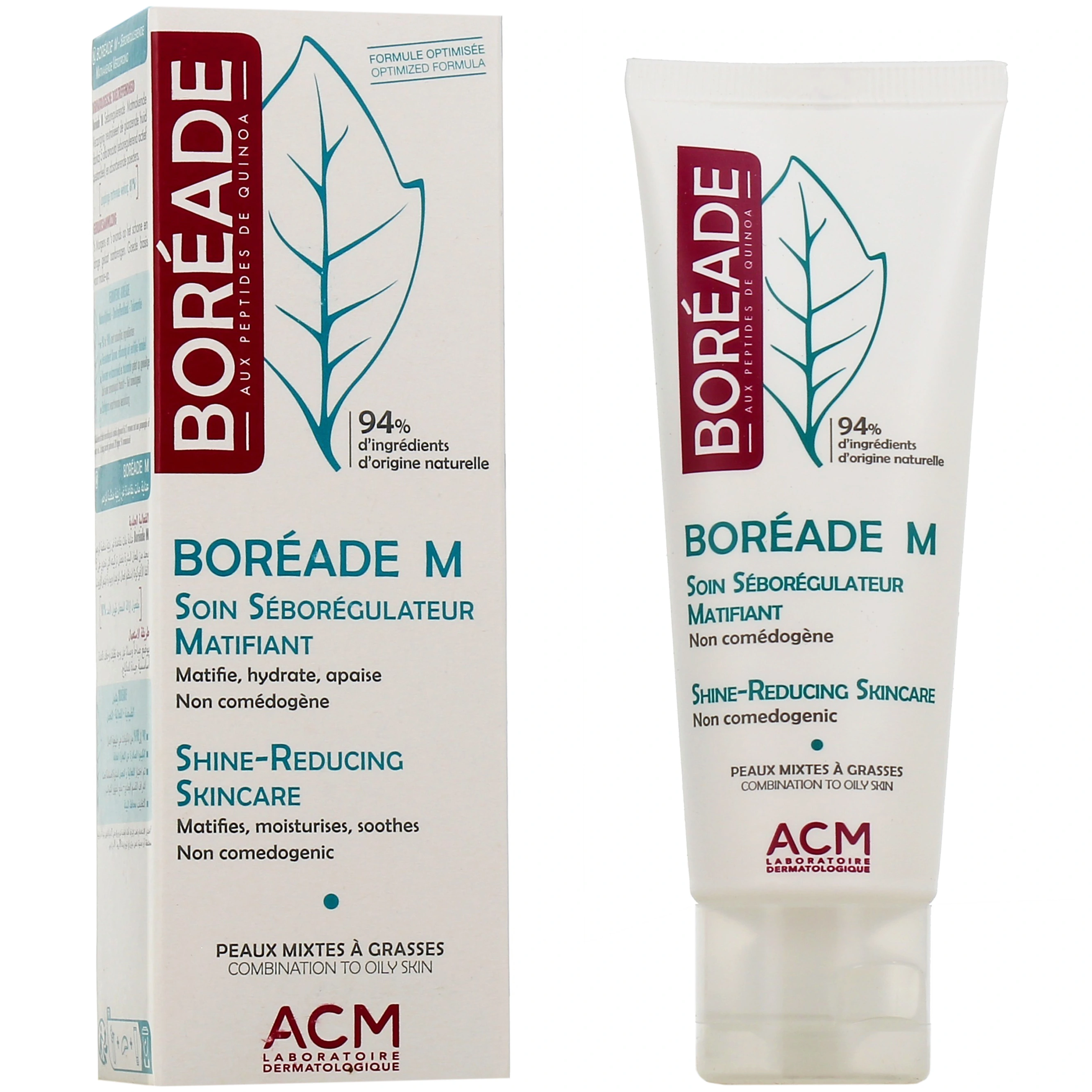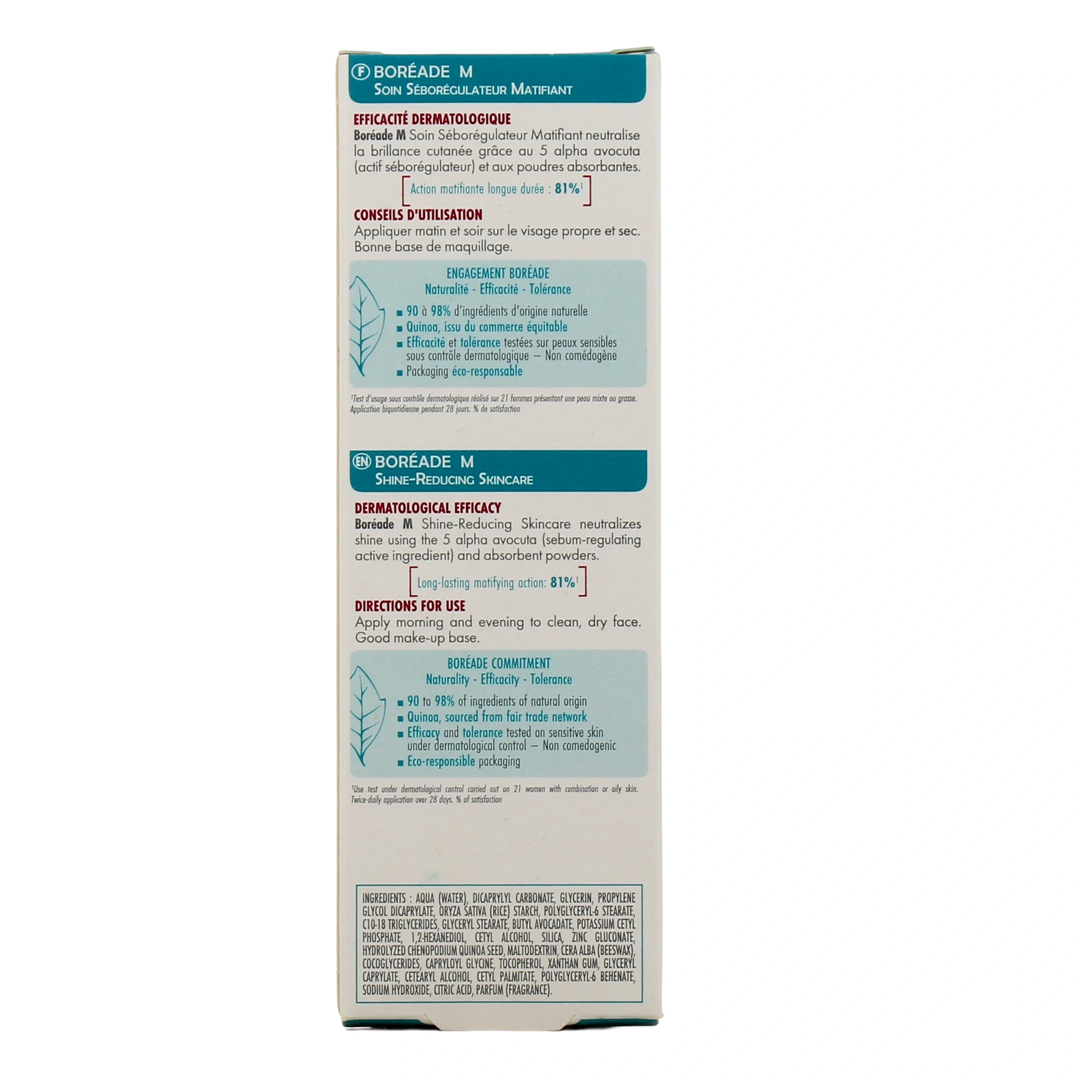Formulé à 92% d'ingrédients d'origine naturelle, le soin seboregulateur matifiant Boreade M neutralise la brillance de la peau pendant 24h grâce au 5α avocuta, à la poudre de riz et au nylon-6, qui sont connus pour agir sur l'excès de sébum. Le complexe S.M.A (Séborégulateur, Matifiant, Antibactérien) de ce soin anti-imperfections aide à resserrer les pores de la peau, à limiter la production excessive de sébum ainsi qu'à prévenir l'apparition de nouvelles imperfections.