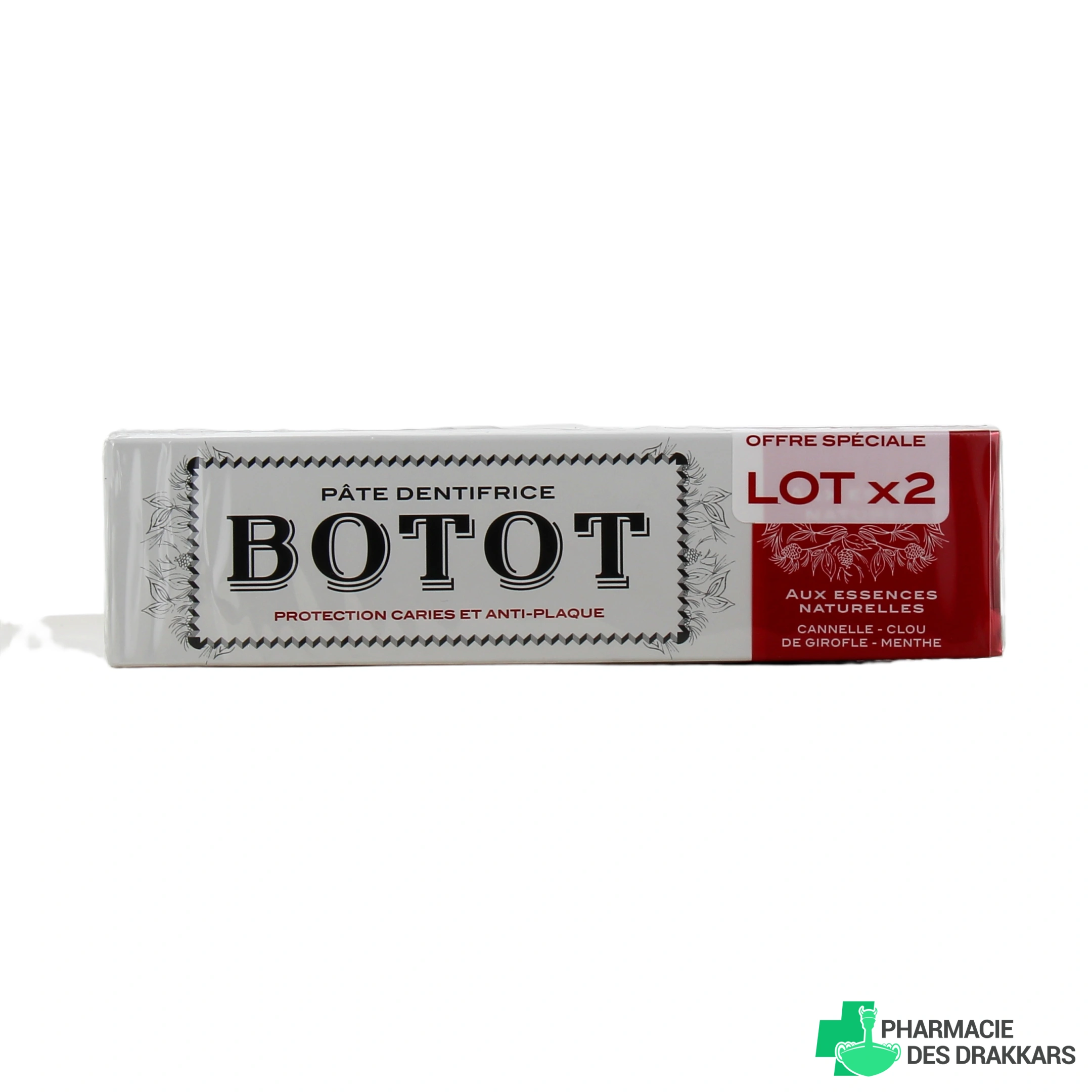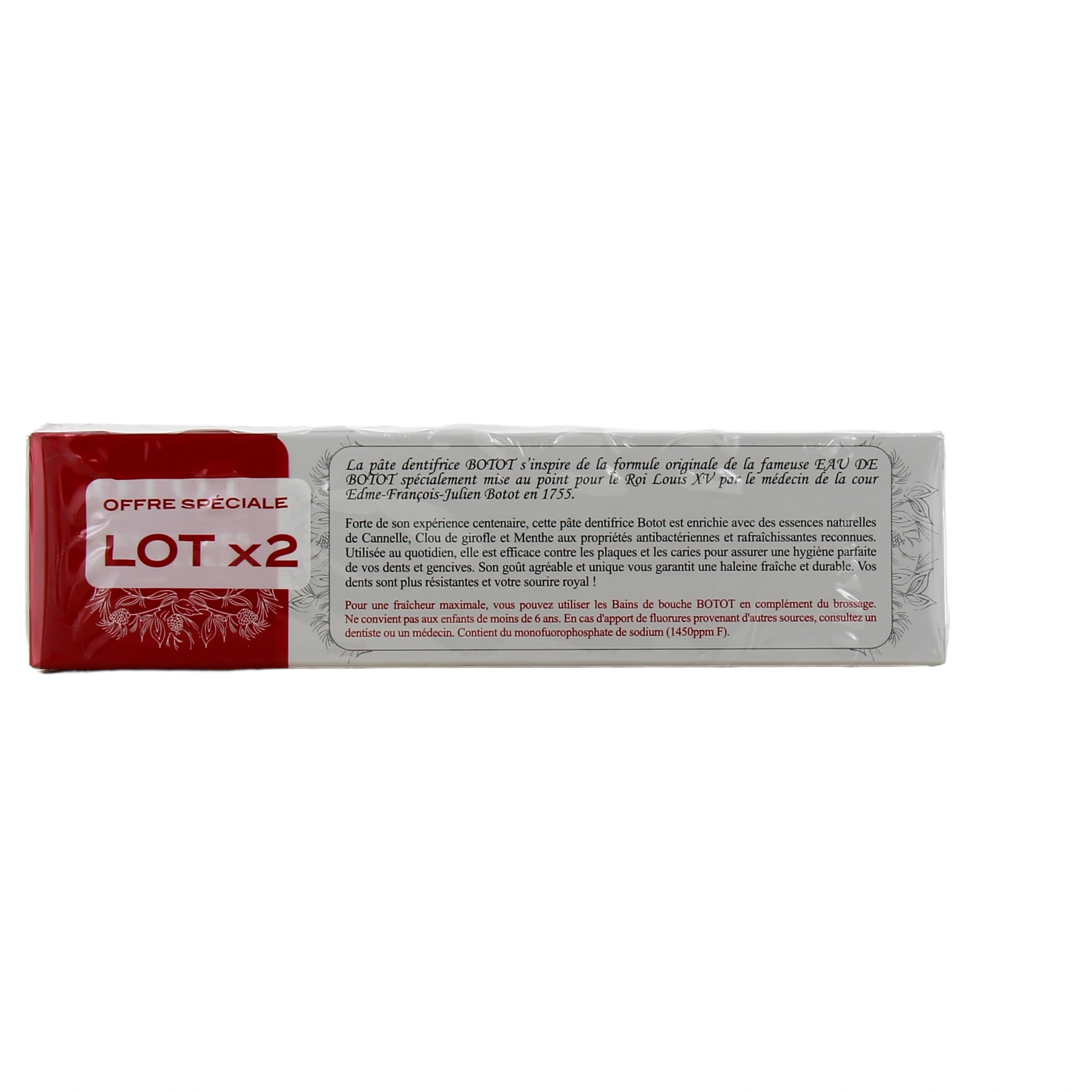 Présentations proposées par votre pharmacie en ligne pour le dentifrice Cannelle Clou de Girofle Menthe Botot : Tube de 75 ml - Lot de 2 tubes de 75 ml.