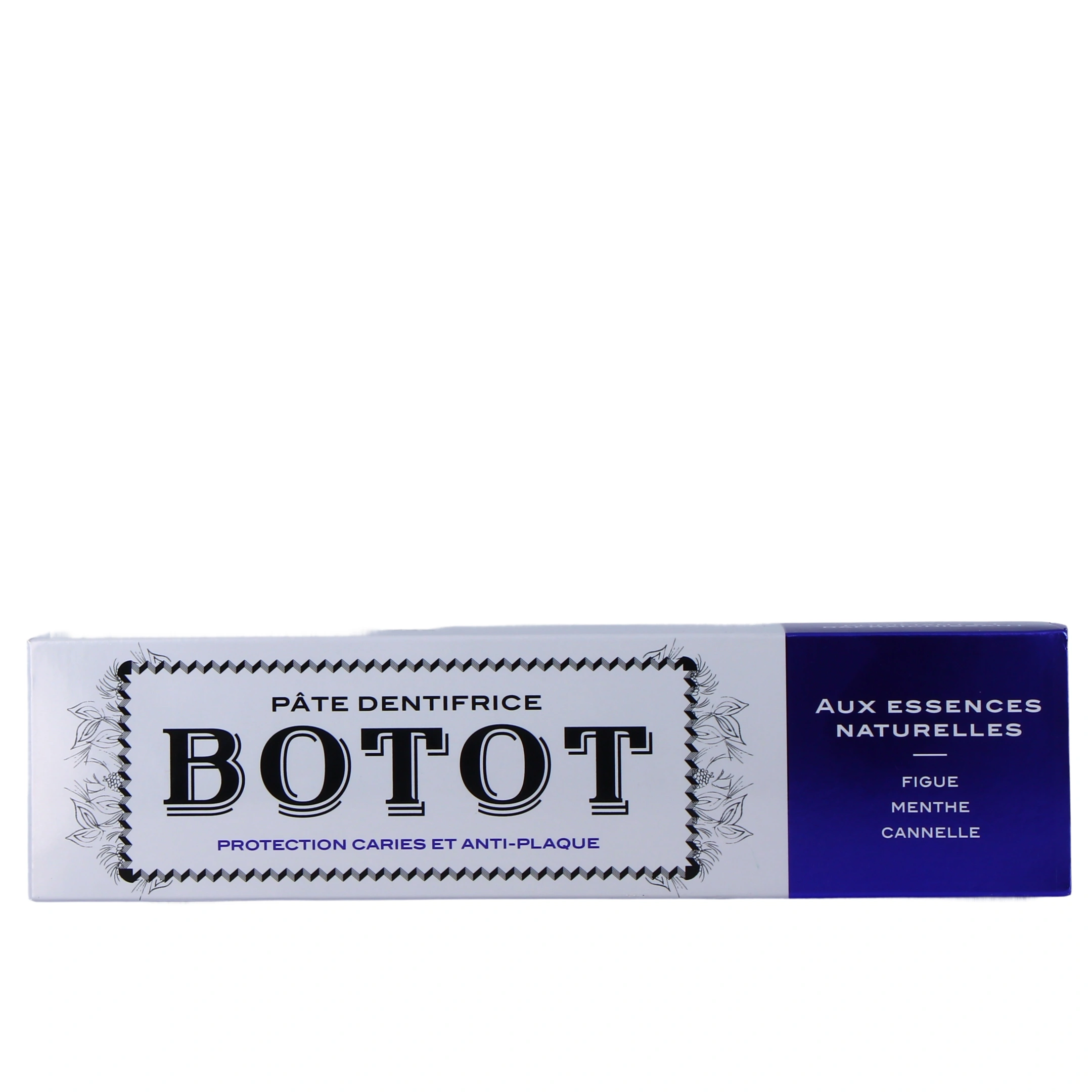 Forte de plus de 2 siècles d'existence (l'Eau de Boto fut créée en 1755 à destination de Louis XV !), Botot vous propose aujourd'hui sa toute nouvelle formule de dentifrice : le dentifrice Botot Figue Menthe Cannelle. Ce dentifrice est formulé comme à l'époque à l'aide d'essences naturelles, sélectionnées pour leurs propriétés rafraichissantes et antibactériennes.