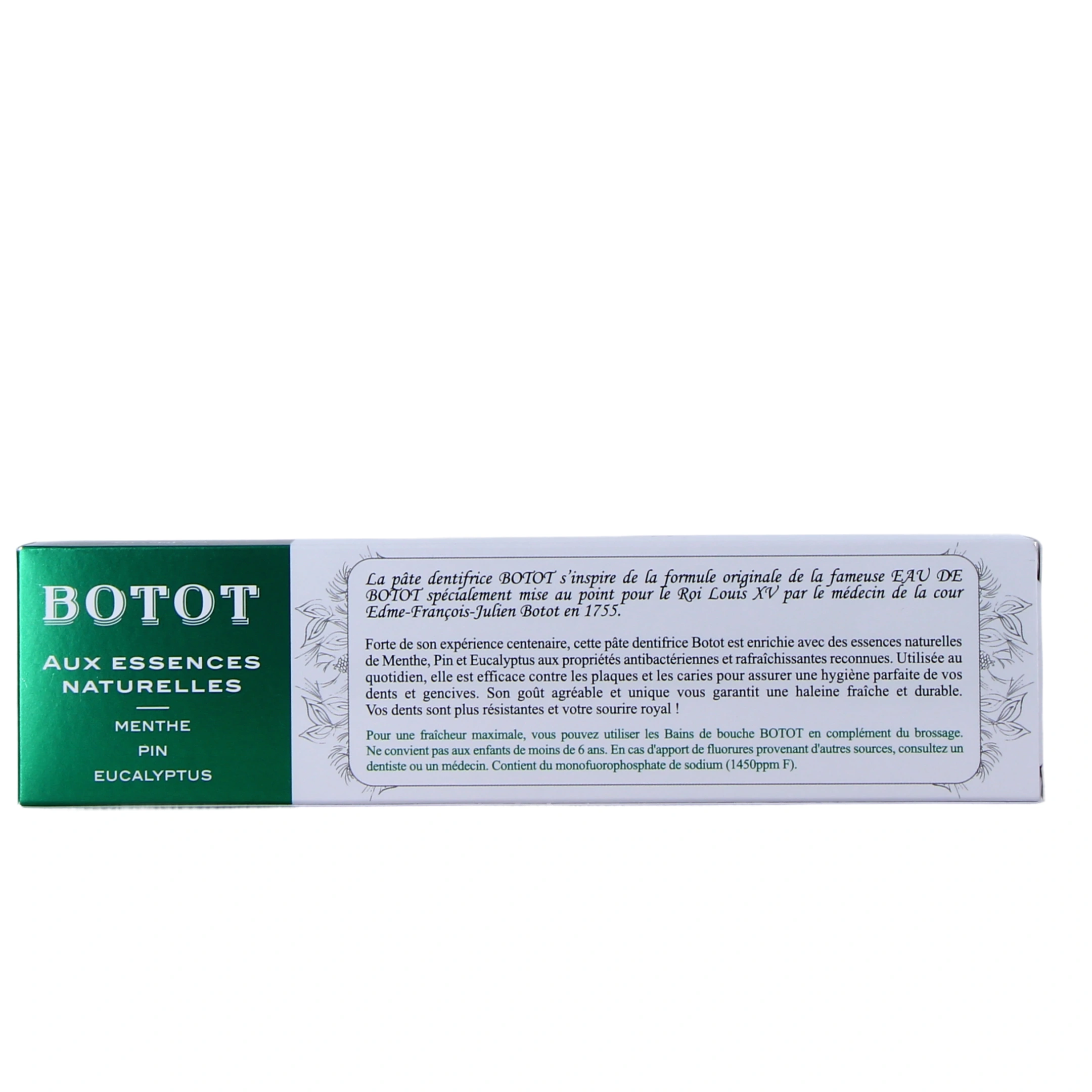 100 % naturel, le dentifrice Botot renferme de l'essence de menthe, de pin et d'eucalyptus pour vous assurer une parfaite hygiène bucco-dentaire. Purifiant et rafraîchissant, il est une solution efficace pour prévenir et lutter contre l'halitose (mauvaise haleine).