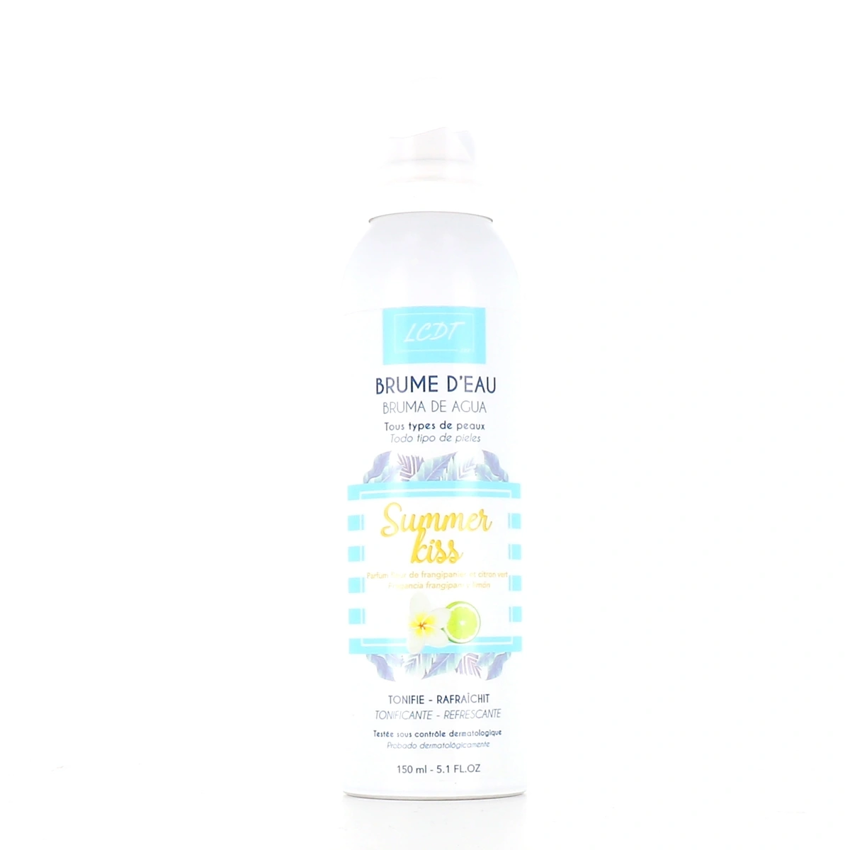 La brume d'eau Summer Kiss est proposée dans les parfums suivants sur notre pharmacie en ligne : mangue & ananas, fleur de frangipanier & citron vert, citron vert & basilic. Pratique à transporter, cette brume vous permet de vous rafraîchir et d'hydrater votre peau dès que cela vous semble nécessaire. La peau semble plus tonique, elle est délicatement parfumée.