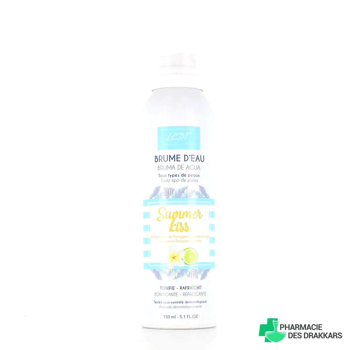 Conditionnement proposé par la Pharmacie des Drakkars pour la brume d'eau Summer Kiss : brumisateur de 150 ml - parfum au choix.