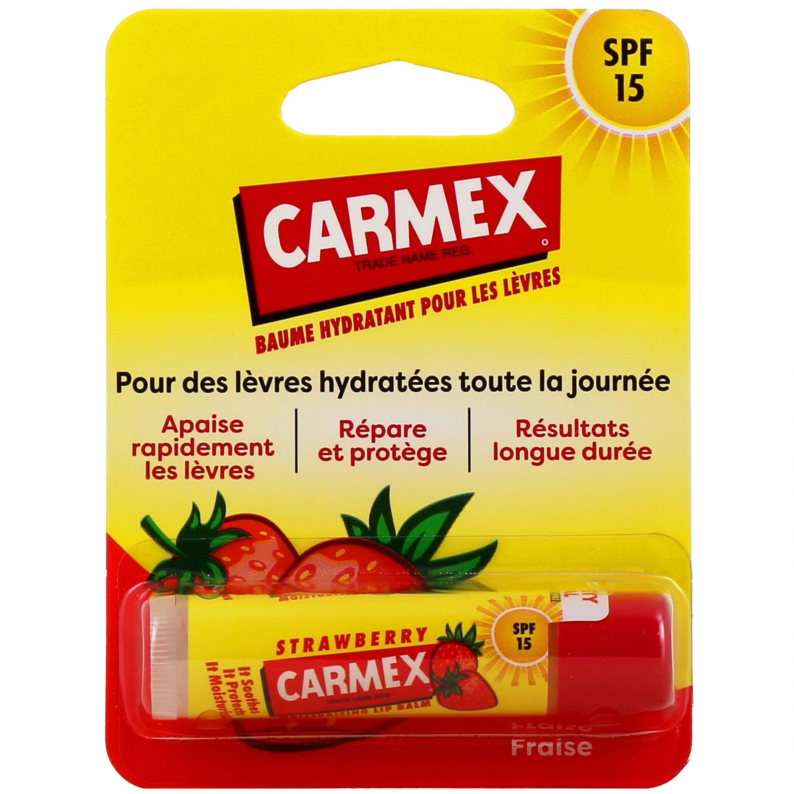 Le stick à lèvres Fraise SPF15 de la marque Carmex est un baume nourrissant pour les lèvres, utilisable toute l'année. Il hydrate, nourrit et protège durablement les lèvres que vous soyez à la maison, au breau, à la mer ou à la montagne !