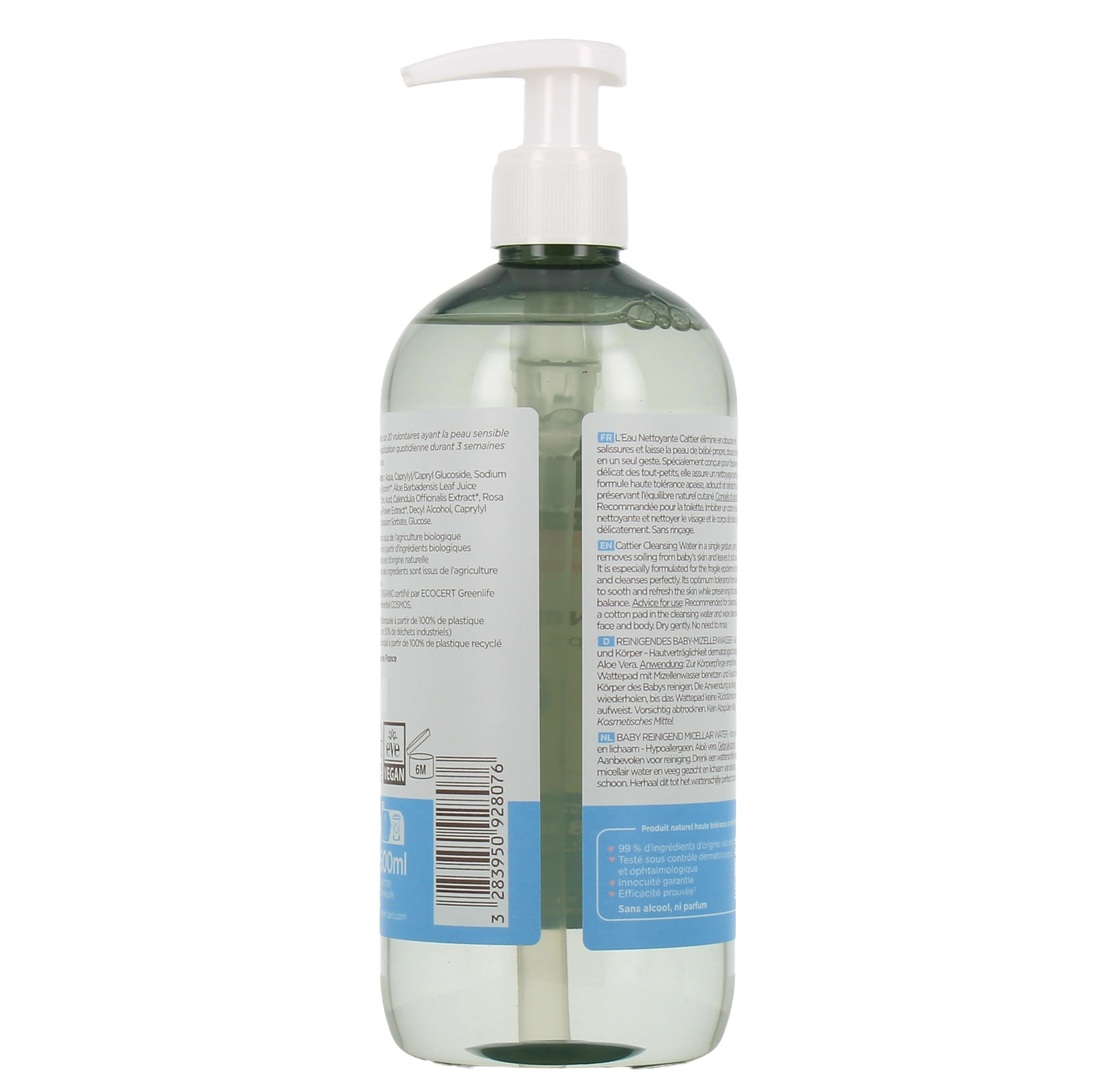 Présentation disponible pour l'eau nettoyante micellaire Cattier Bébé sur notre pharmacie en ligne : Flacon-pompe de 500 ml