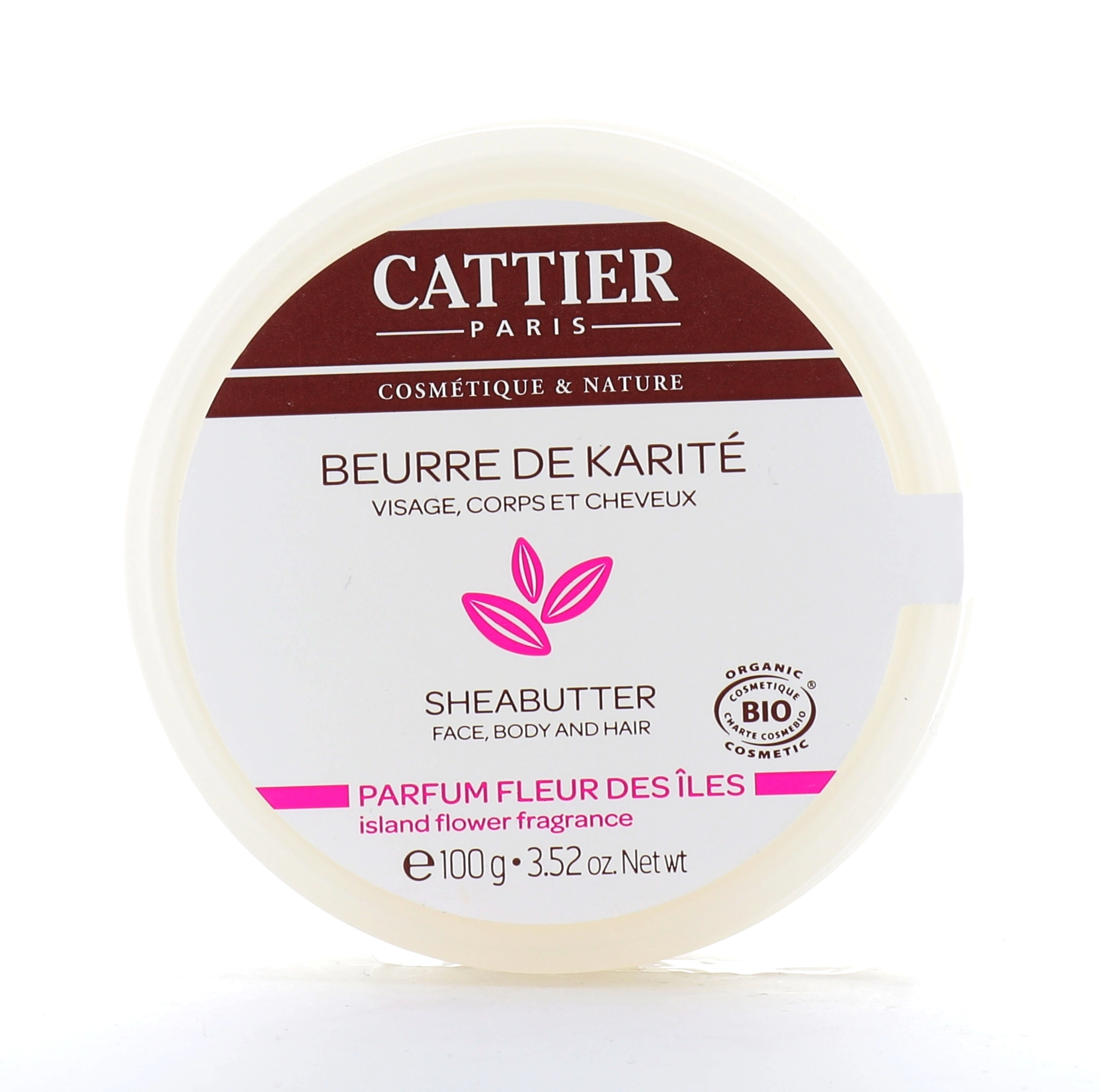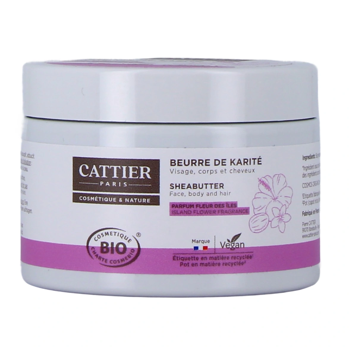 Présentation proposée par votre pharmacie en ligne pour le beurre de karité parfum fleur des îles Cattier Bio : pot de 100g.