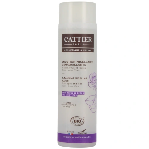 La solution micellaire démaquillante de la marque Cattier est un démaquillant bio qui convient à tous les types de peau. Enrichie en rose et aloe vera, elle démaquille, apaise et rafraîchit le visage, les yeux et les lèvres.