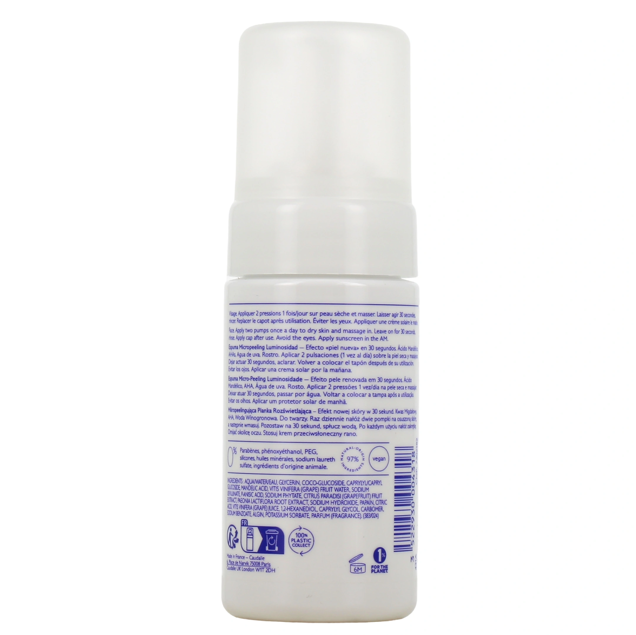 Destinée à vous offrir un teint plus lumineux, mais également bien uniforme, la mousse Micro-Peeling éclat Vinoperfect de Caudalie est formulée à partir d'acide mandélique, d'AHAs et d'eau de raisin Bio. Au total, sa composition renferme 97% d'ingrédients issus de la nature. Elle est par ailleurs vegan, a obtenu la note de 100/100 sur l'application Yuka, et a fait l'objet de tests sous contrôles dermatologique et ophtalmologique.