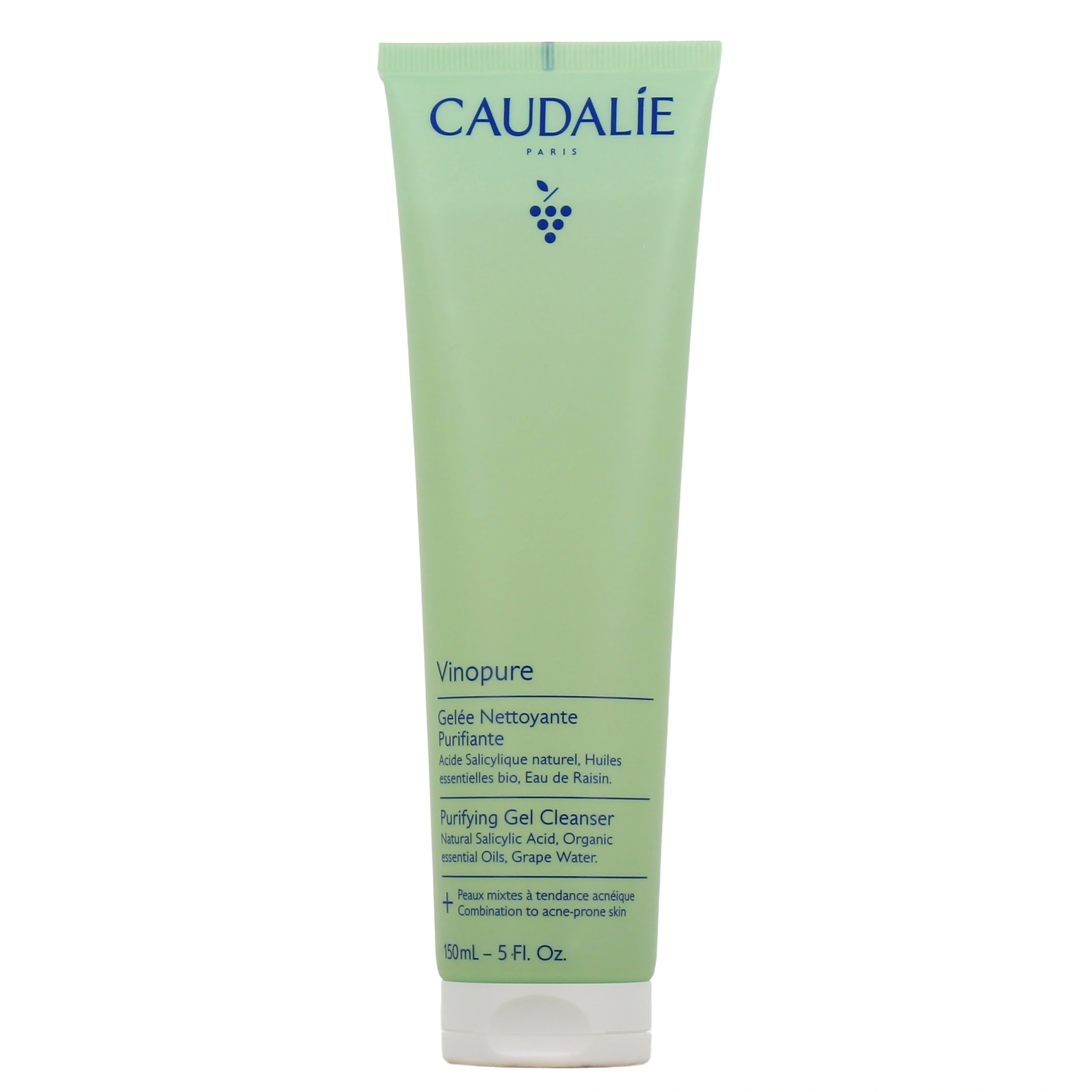 Présentation proposée par votre pharmacie en ligne pour la gelée nettoyante purifiante Vinopure Caudalie : tube de 75 ou 150 ml ; flacon-pompe de 385 ml.