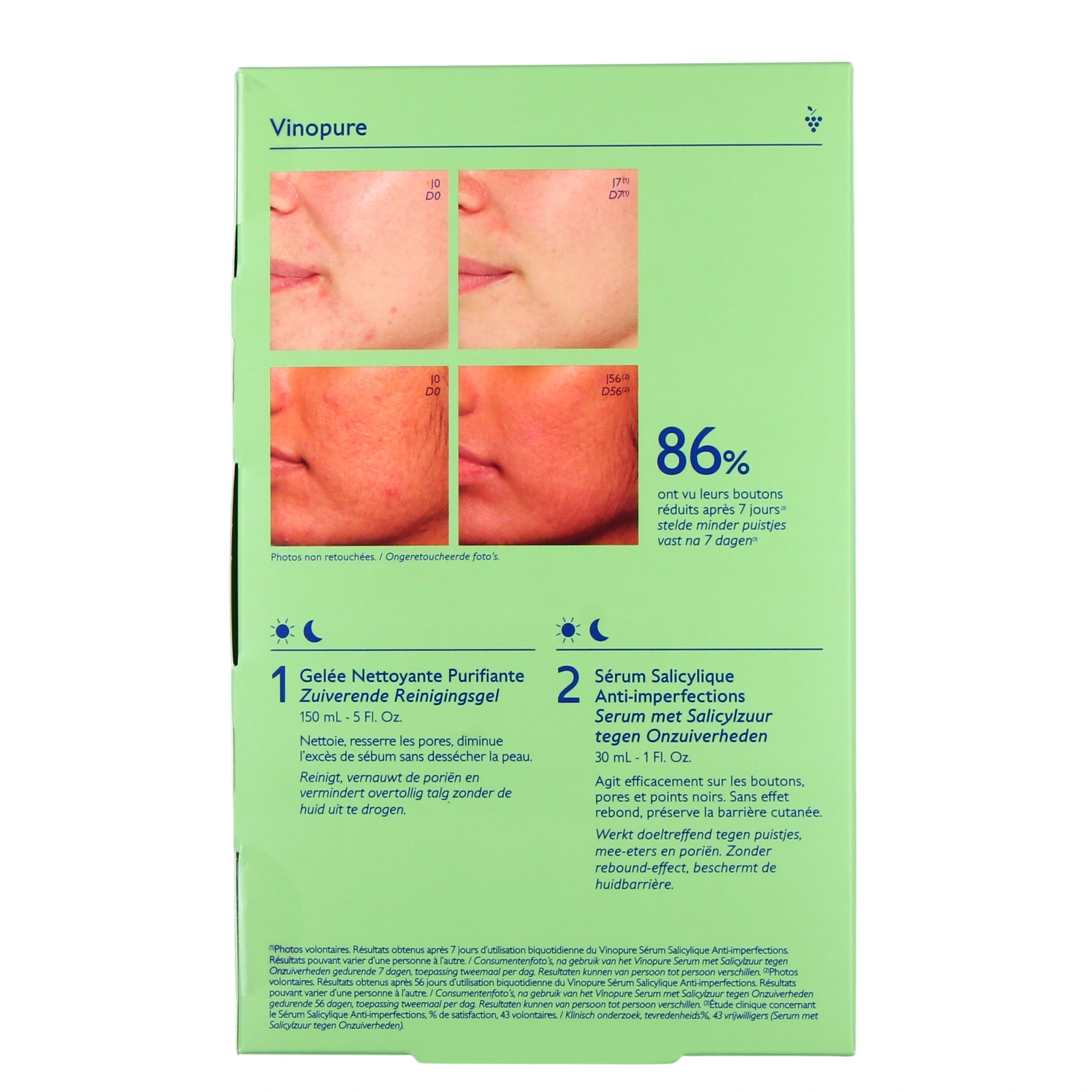 Pour prendre soin des peaux mixtes à grasses, la gelée nettoyante purifiante Vinopure contient de l'Acide Salicylique naturel qui permet à ce soin de désincruster et resserrer les pores. Cet actif permet également d'affiner visiblement le grain de peau. Les Polyphénols de Raisins contribuent à réduire les imperfections grâce à leur action antioxydante et anti-rides. De son côté, l'Eau de Raisin permet d'hydrater et d'apaiser l'épiderme. L'huile essentielle de Lavande est anti-inflammatoire et apaisante, l'huile essentielle de Citronnelle apporte une action drainante, décongestionnante et anti-cellulite. L'huile essentielle de Menthe Poivrée permet de tonifier et réveiller le teint terne, pour plus d'éclat tandis que l'huile essentielle de Romarin offre une action anti-inflammatoire et anti-bactérienne.