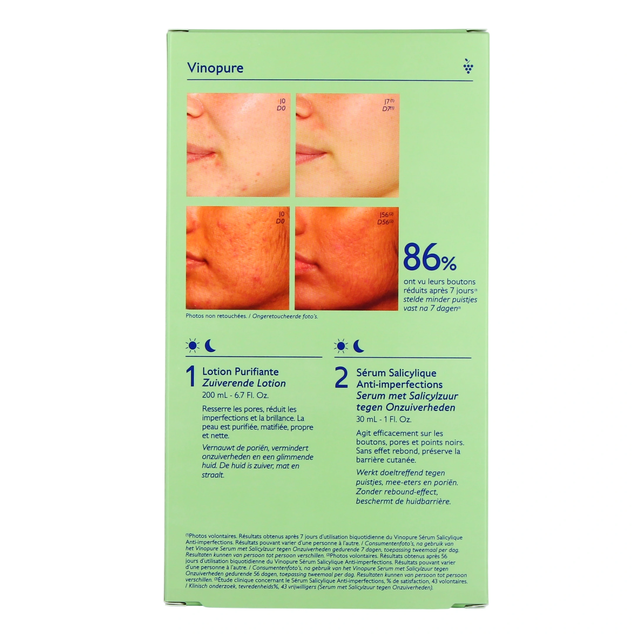 Concentré en acide salicylique naturel, en huiles essentielles d'origine biologique et en hydrolat de rose, le sérum salicylique Vinopure exerce un peeling doux sur la peau pour accélérer son renouvellement cellulaire. Les imperfections s'estompent, les pores se resserrent. La peau est visiblement purifiée plus nette et le grain de peau affiné. Le capital jeunesse de la peau est préservé par les polyphénols de raisins contenus au coeur de la formule, un puissant antioxydant. Purifiée, la peau est plus douce, plus éclatante.