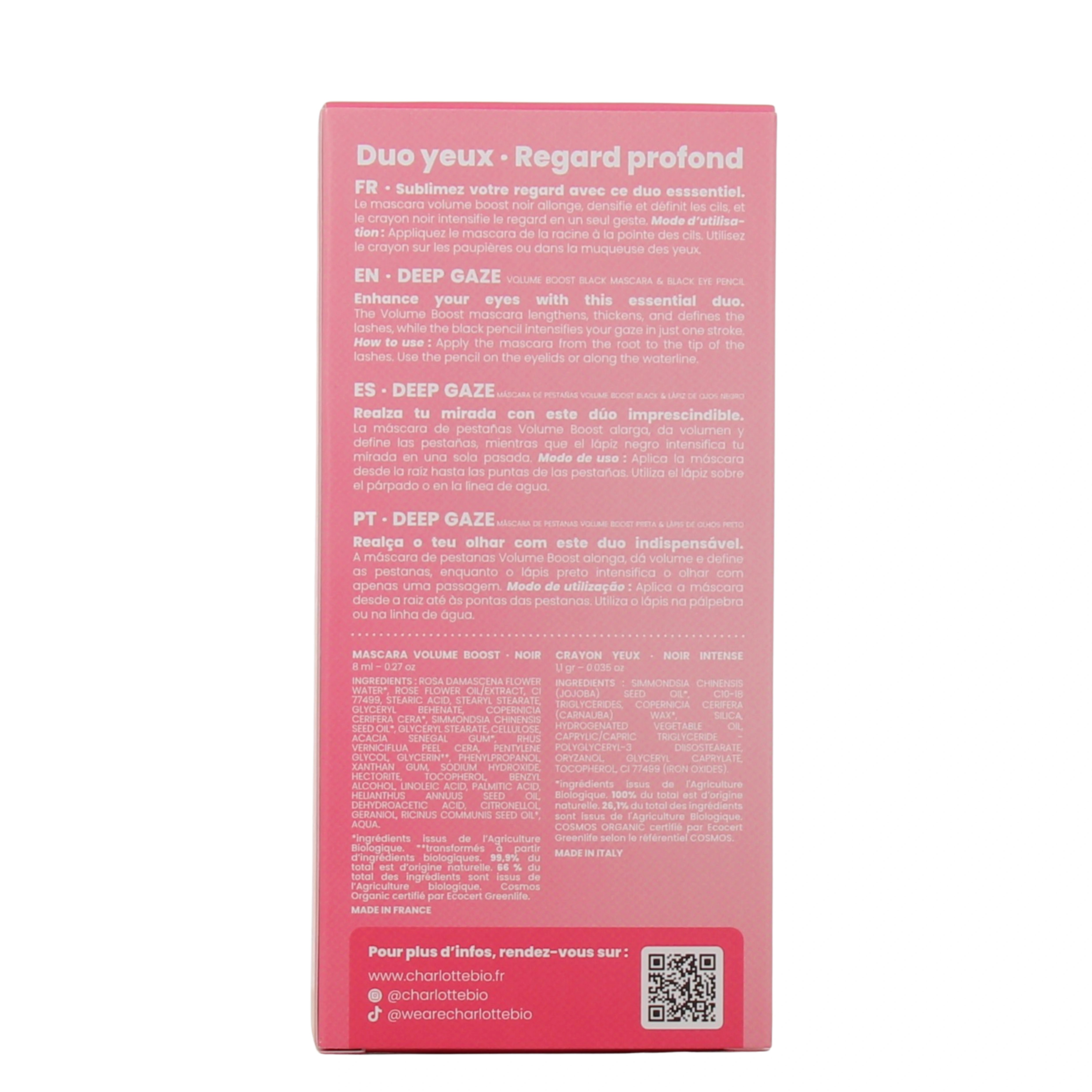 Pour des yeux de biche et un regard plus profond que jamais, Charlotte bio a conçu le coffret duo yeux. Comme son nom l'indique, celui-ci se compose de deux produits de maquillage pour les yeux : le mascara volume boost et le crayon yeux, tous les deux en teinte noire.