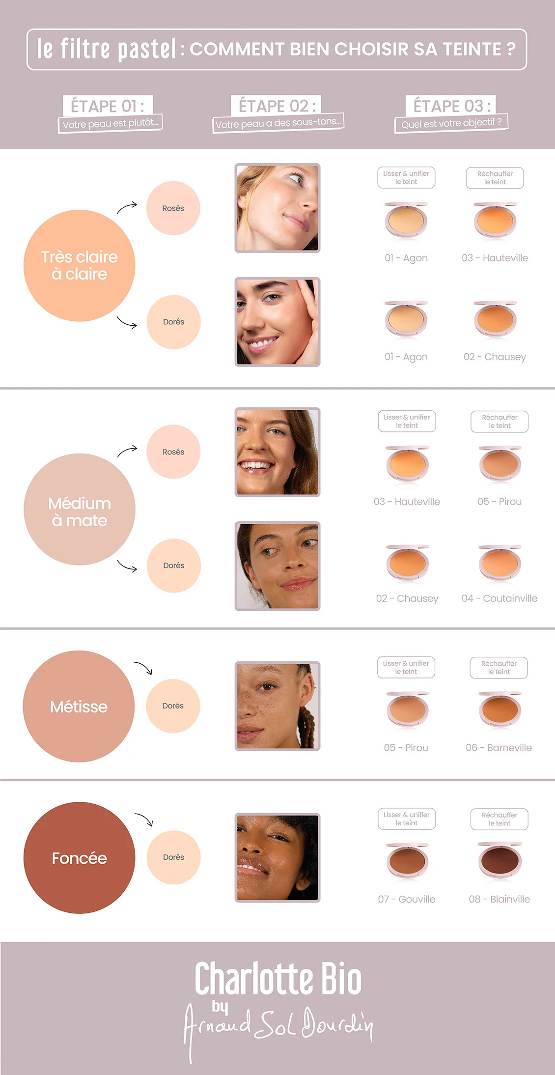 Le filtre pastel de Charlotte Bio est doté d'une texture douce et laisse un voile pastellisé, flouteur et lumineux. Il assure un teint parfait pour toute la journée et se décline en 8 teintes afin de s'adapter à un maximum de carnations : 01 - Agon, 02 - Chausey, 03 - Hauteville, 04 - Coutainville, 05 - Pirou, 06 - Barneville, 07 - Gouville et 08 - Blainville.