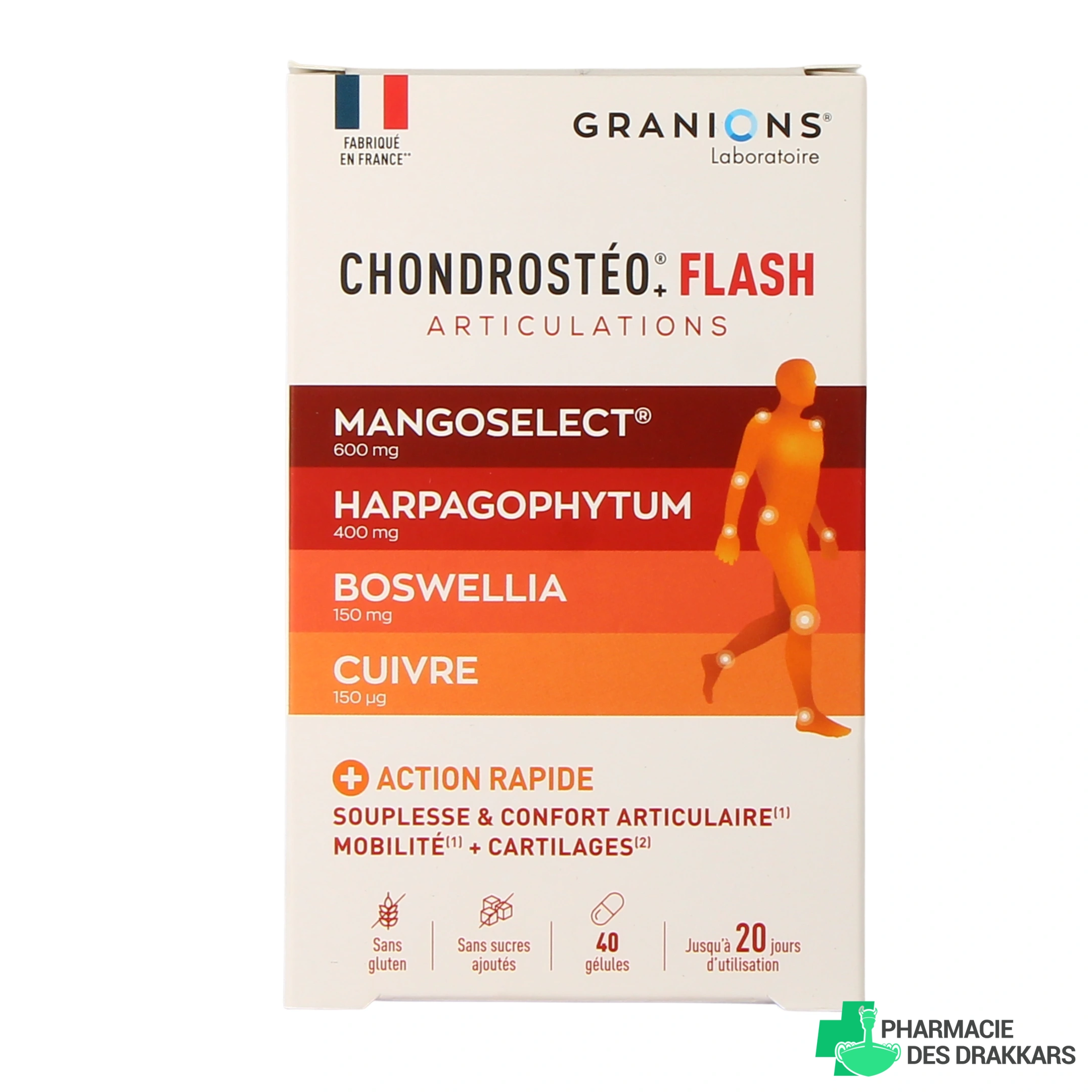 Les Laboratoires Granions ont donc développé Chondrostéo Flash, une formule innovante qui aide à retrouver confort et flexibilité dans ses articulations de façon rapide et efficace.