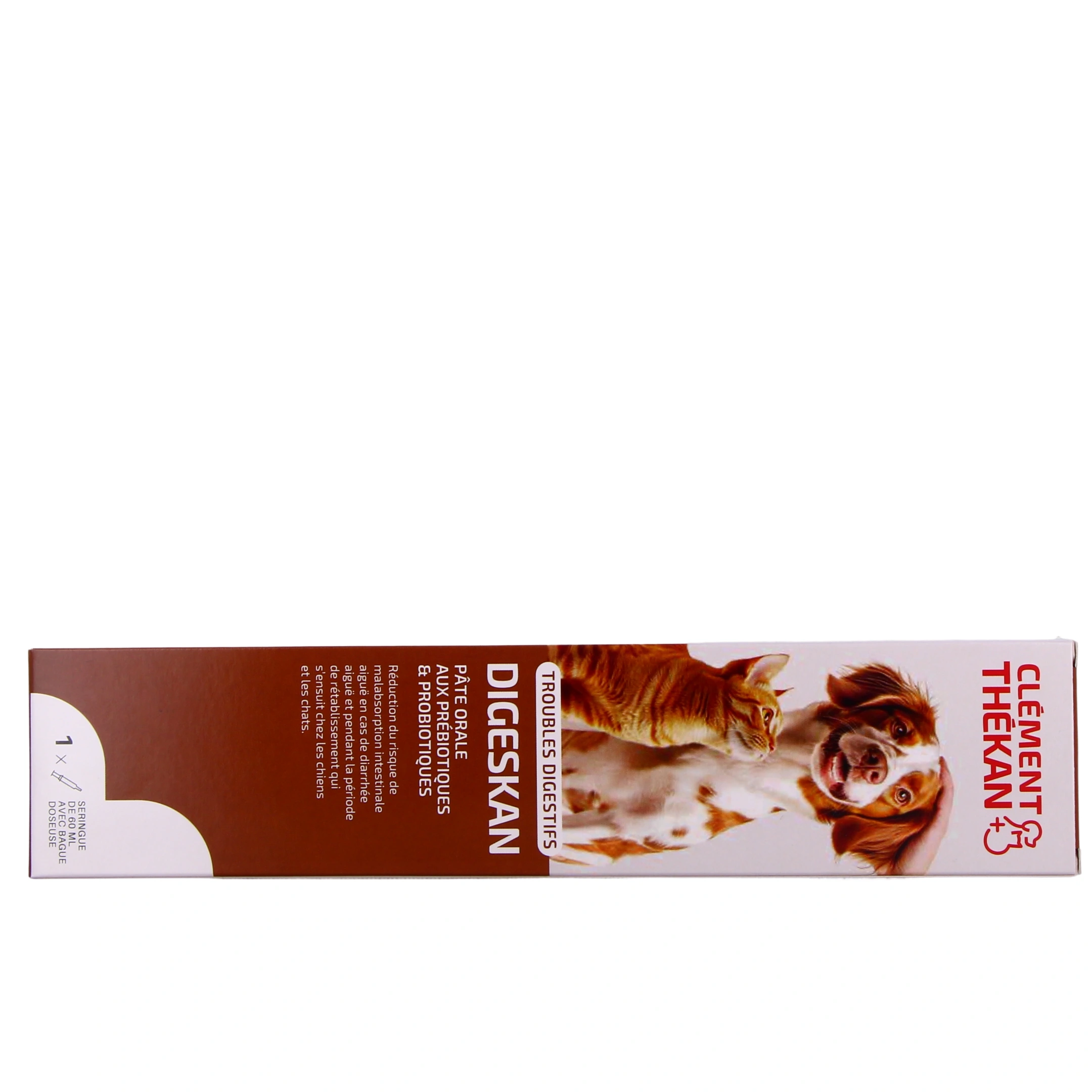 Proposé sous la forme d'une pâte orale convenant tout autant pour les félins que pour les chiens, Digeskan Chien et Chat de Clément Thékan est un aliment complémentaire dont la formule est à base de probiotiques, de prébiotiques et d'argile montmorillonite. Il est destiné aux animaux qui sont touchés par des troubles digestifs.