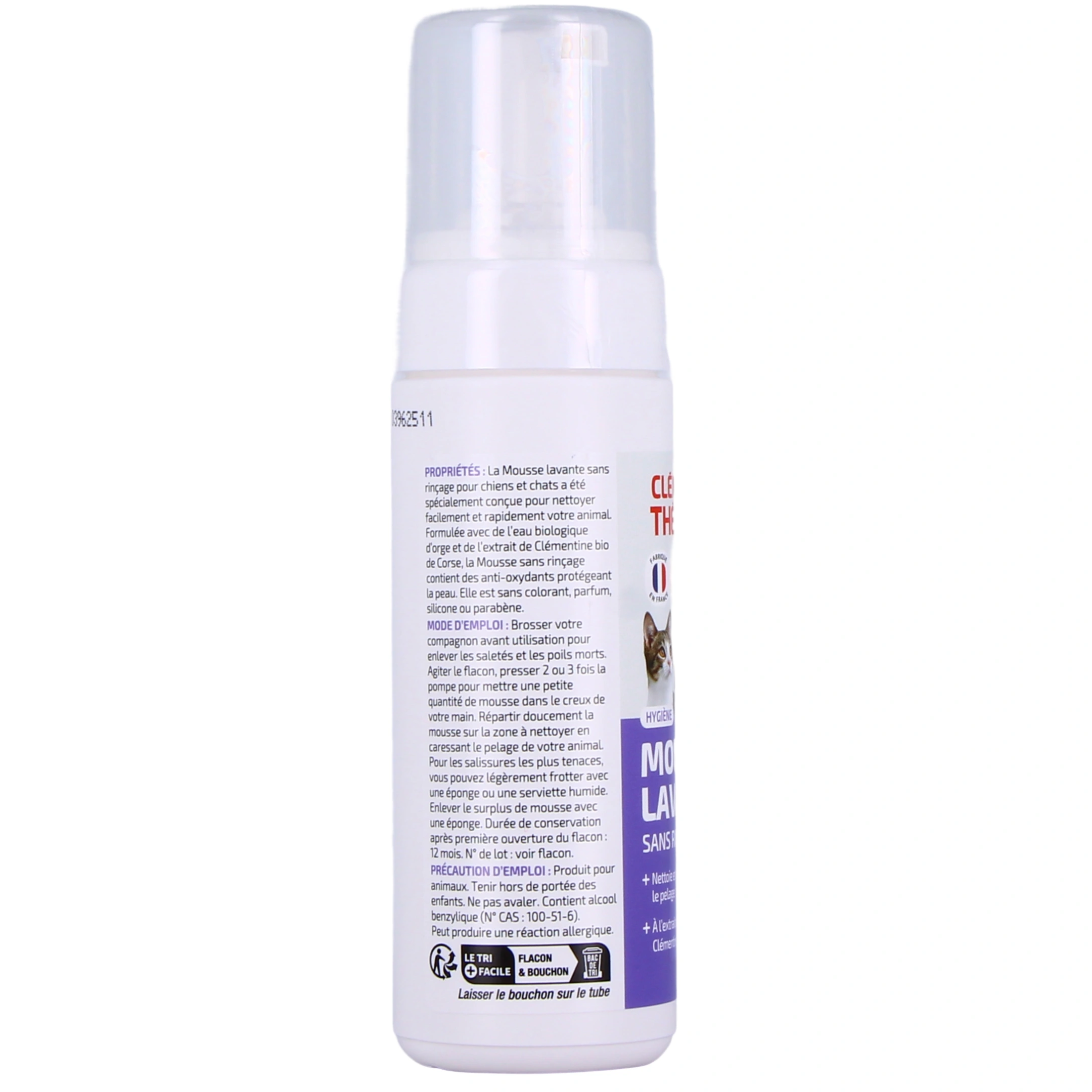 Formulée à partir d'extrait de clémentine Bio produite en Corse et possédant des vertus purifiantes et antibactériennes, la mousse lavante Vétosan de Clément Thékan est fabriquée en France, et sa formule ne contient ni colorant ni parfum. Certifiée Ecocert, elle présente l'avantage non négligeable de ne pas avoir besoin d'être rincée. Vous pourrez ainsi aider votre compagnon à 4 pattes à retrouver un pelage bien propre et purifié sans avoir à lui donner de bain, ni même à utiliser de l'eau !