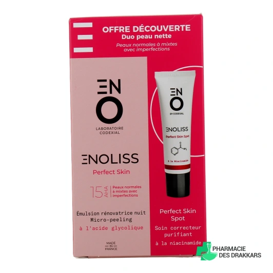 Vous pourrez retrouver l'émulsion rénovatrice Enoliss Perfect Skin 15 AHA de Codexial dans les conditionnements suivants sur notre pharmacie en ligne : tube pompe de 30 ml à l'unité, en coffret Duo anti-imperfections avec Enoliss Perfect Skin Oil 20 ml ou en coffret Duo peau nette avec Perfect Skin Spot 30ml.