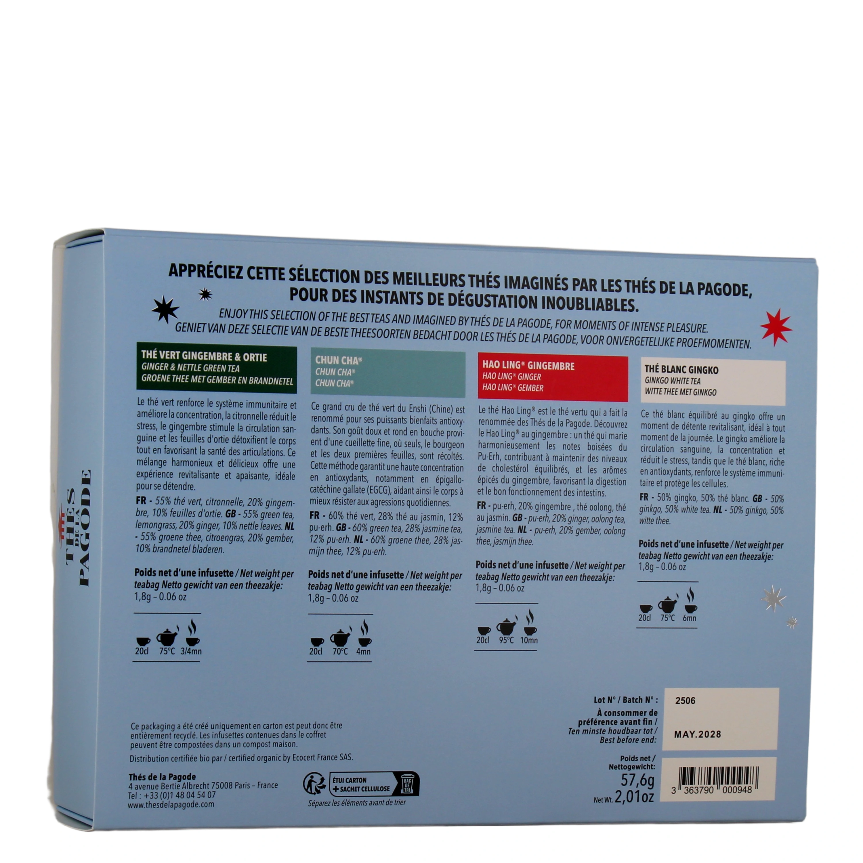 Vous pourrez retrouver le coffret découverte 4 Thés Bien-Être des Thés de la Pagode dans les présentations suivantes chez Pharmacie des Drakkars : boîte de 32 sachets (4 parfums : Thé Vert Gingembre & Ortie, Thé Vert Chun Cha, Thé Hao Ling Gingembre et Thé Blanc Gingko).