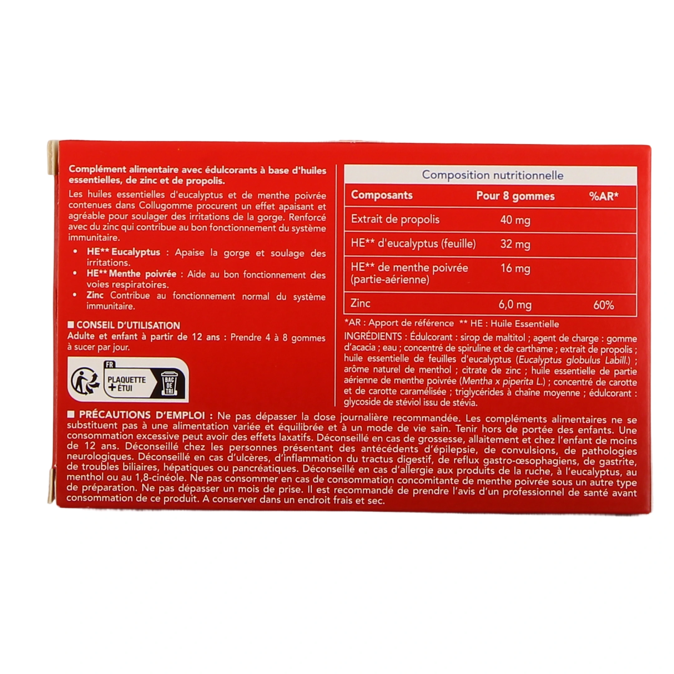 Collugomme est un complément alimentaire réservé à l'adulte et à l'enfant à partir de 6 ans. Chez l'adulte, la dose indiquée est de 4 à 8 gommes par jour. Chez l'enfant, 2 à 4 gommes par jour. Ne pas dépasser 1 mois de prise. Précautions d'emploi de Collugomme :- Les compléments alimentaires ne peuvent être utilisés comme substituts d'un régime alimentaire varié et équilibré et d'un mode de vie sain.