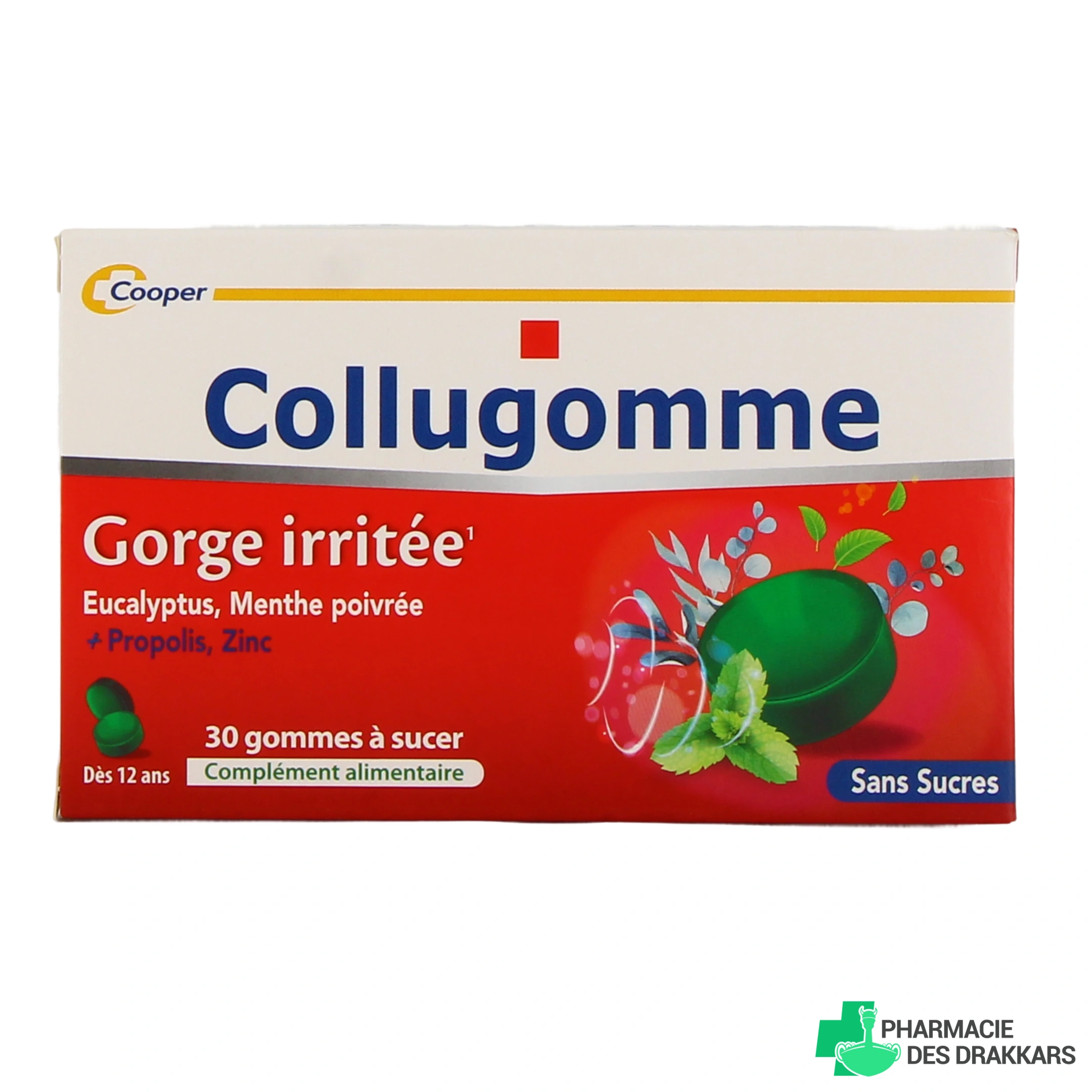 Collugomme est un complément alimentaire proposé par le laboratoire Cooper. Indiqué dès 6 ans en cas de gorge irritée, il est formulé avec des huiles essentielles d'eucalyptus et de menthe poivrée, de la propolis et du zinc.