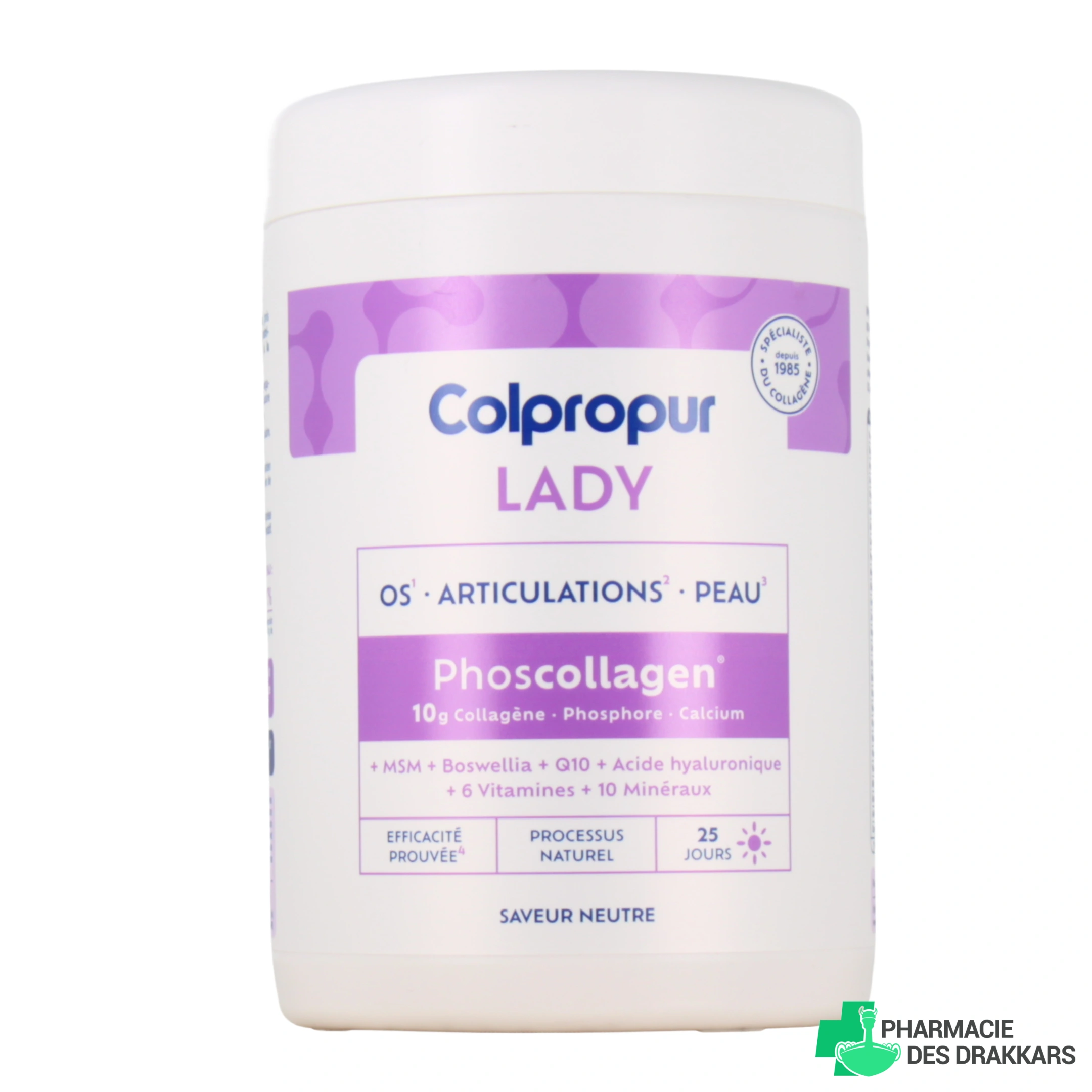Colpropur Lady est un complément alimentaire à base de Phoscollagen®, un complexe associant du collagène, du calcium et du phosphore. Anti-âge, il agit sur les os, la peau et les articulations.