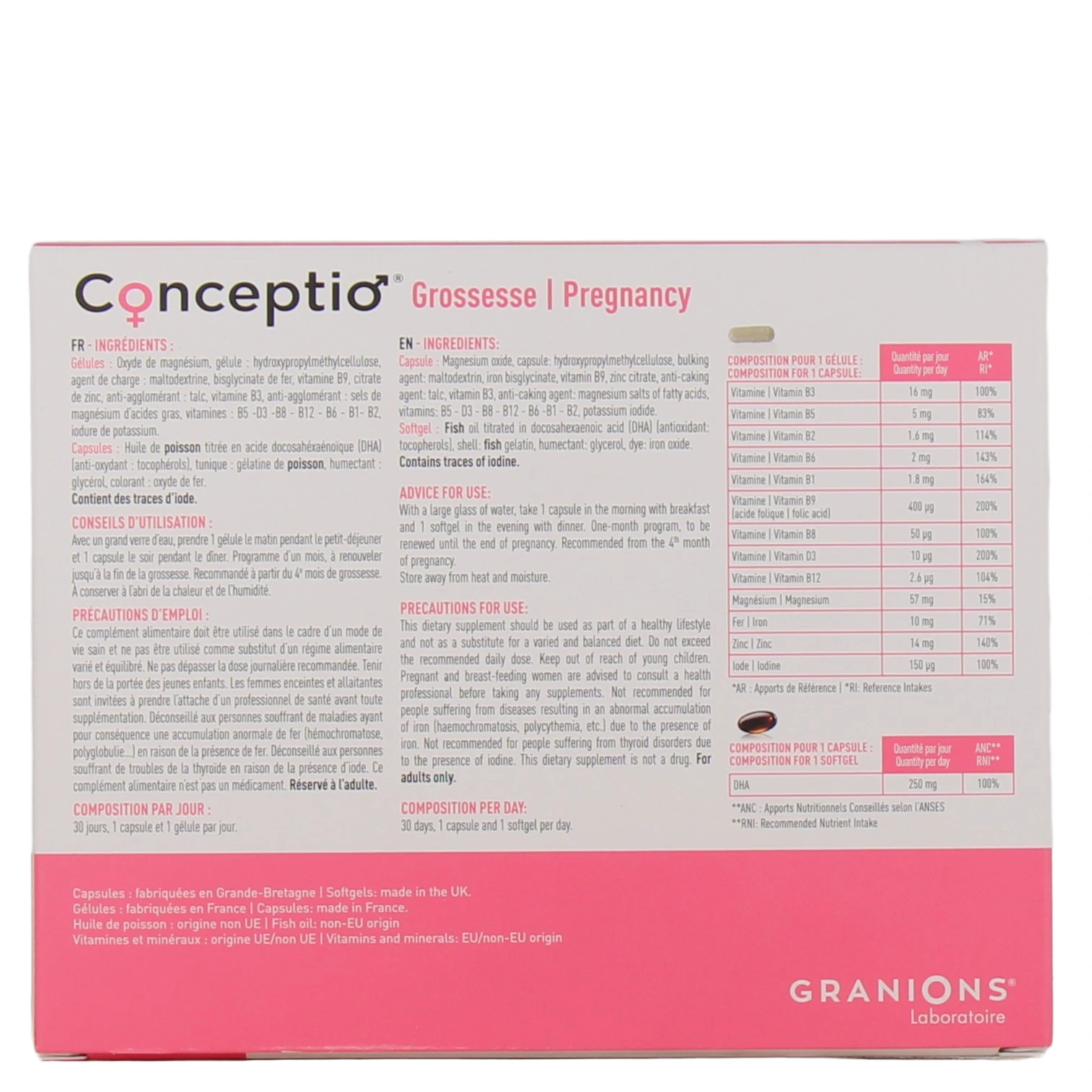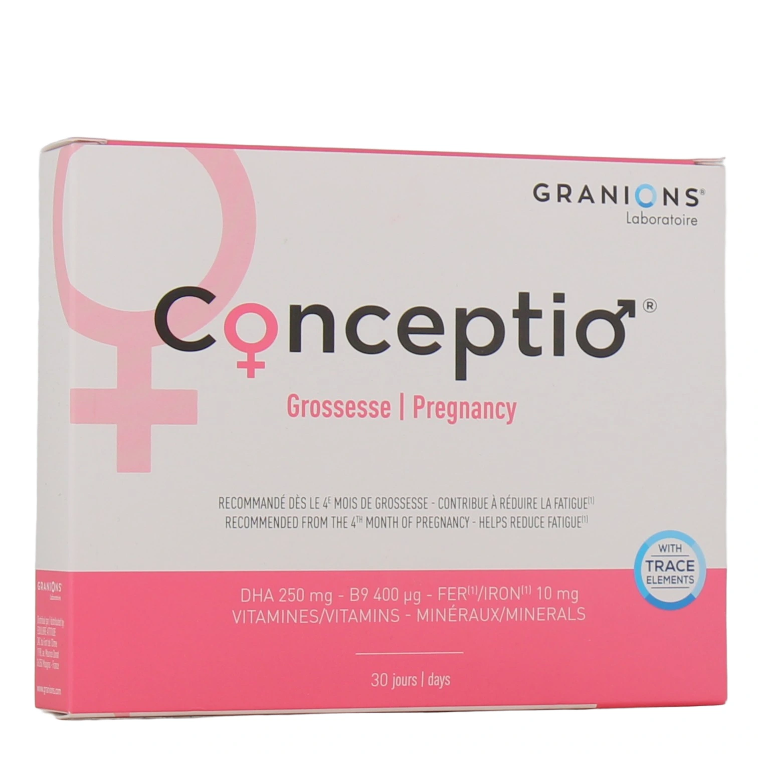 Conceptio Grossesse est un complément alimentaire du laboratoire des Granions sous forme de gélules et de comprimés, et recommandé dès le 4ème mois de grossesse.