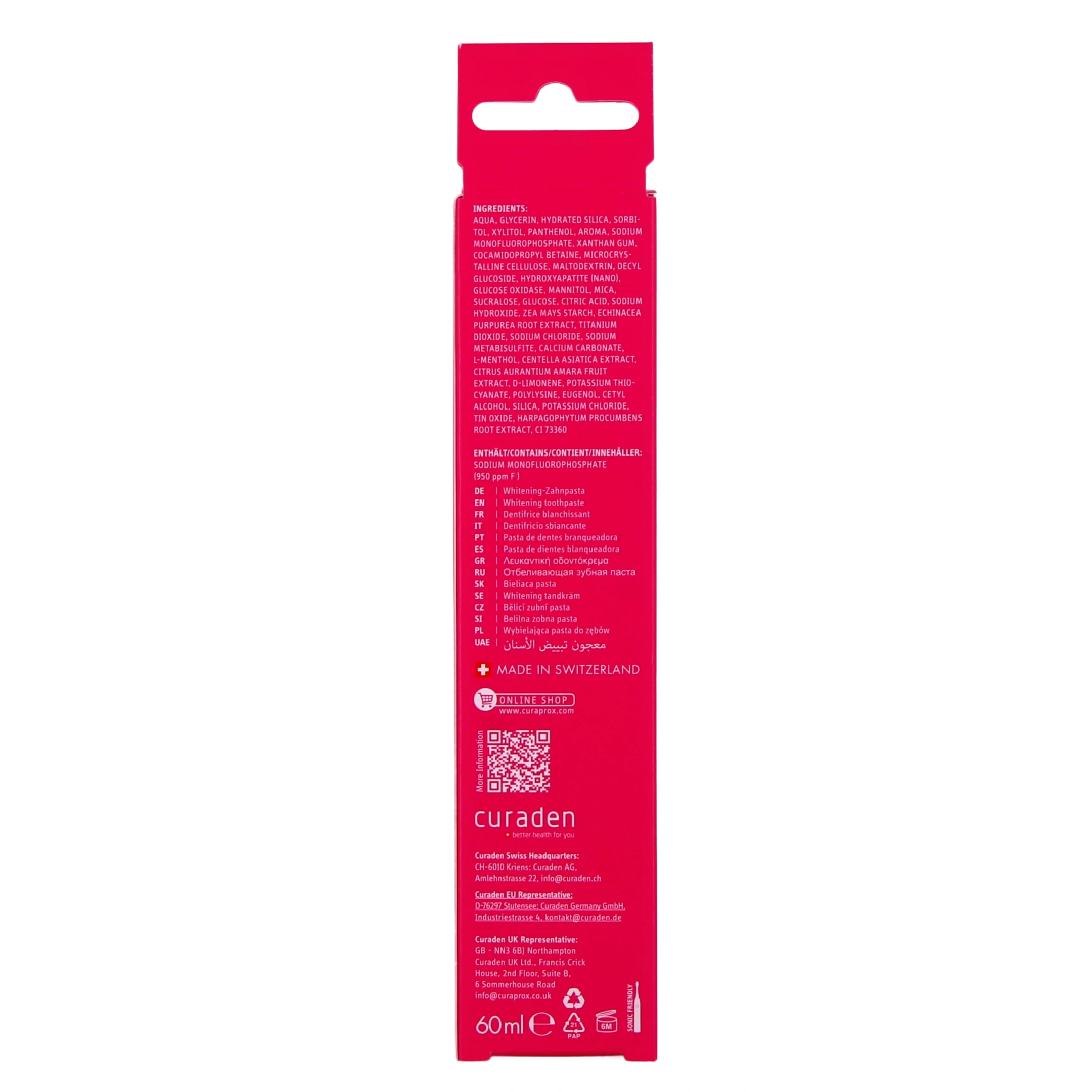 Au sein de ce dentifrice Curaprox, le fluorure renforce l'émail et protège efficacement contre les caries. L'hydroxyapatite et la glucose oxydase, composants d'origine naturelle, assurent un effet blanchissant respectueux des dents. Le xylitol, sucre issu du bouleau, lutte contre les bactéries tout en renforçant les dents. Les extraits végétaux d'échinacée, d'orange amère, d'harpagophyton et d'herbe du tigre soutiennent la muqueuse buccale et préviennent les inflammations tandis que la provitamine B5 favorise le renouvellement cellulaire.