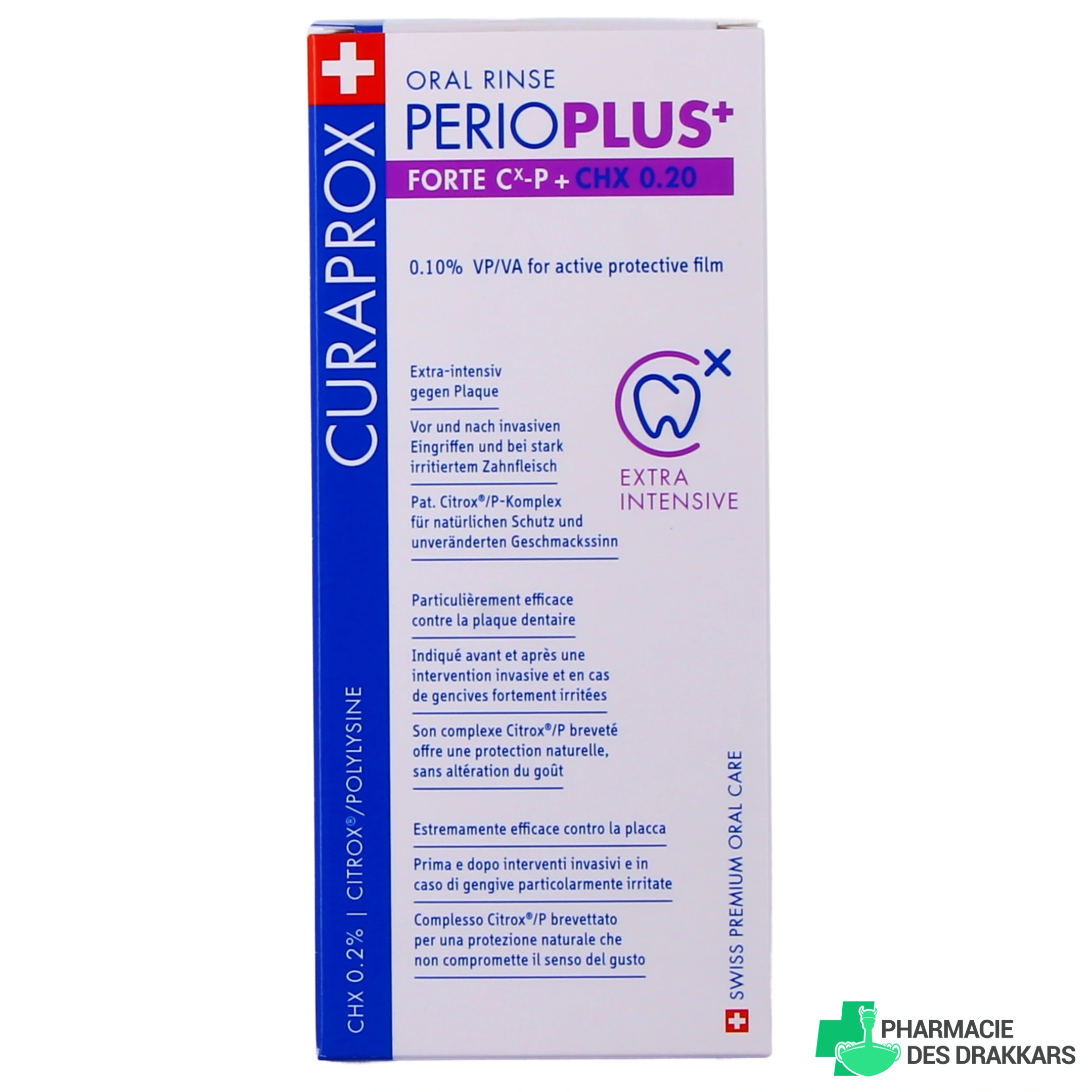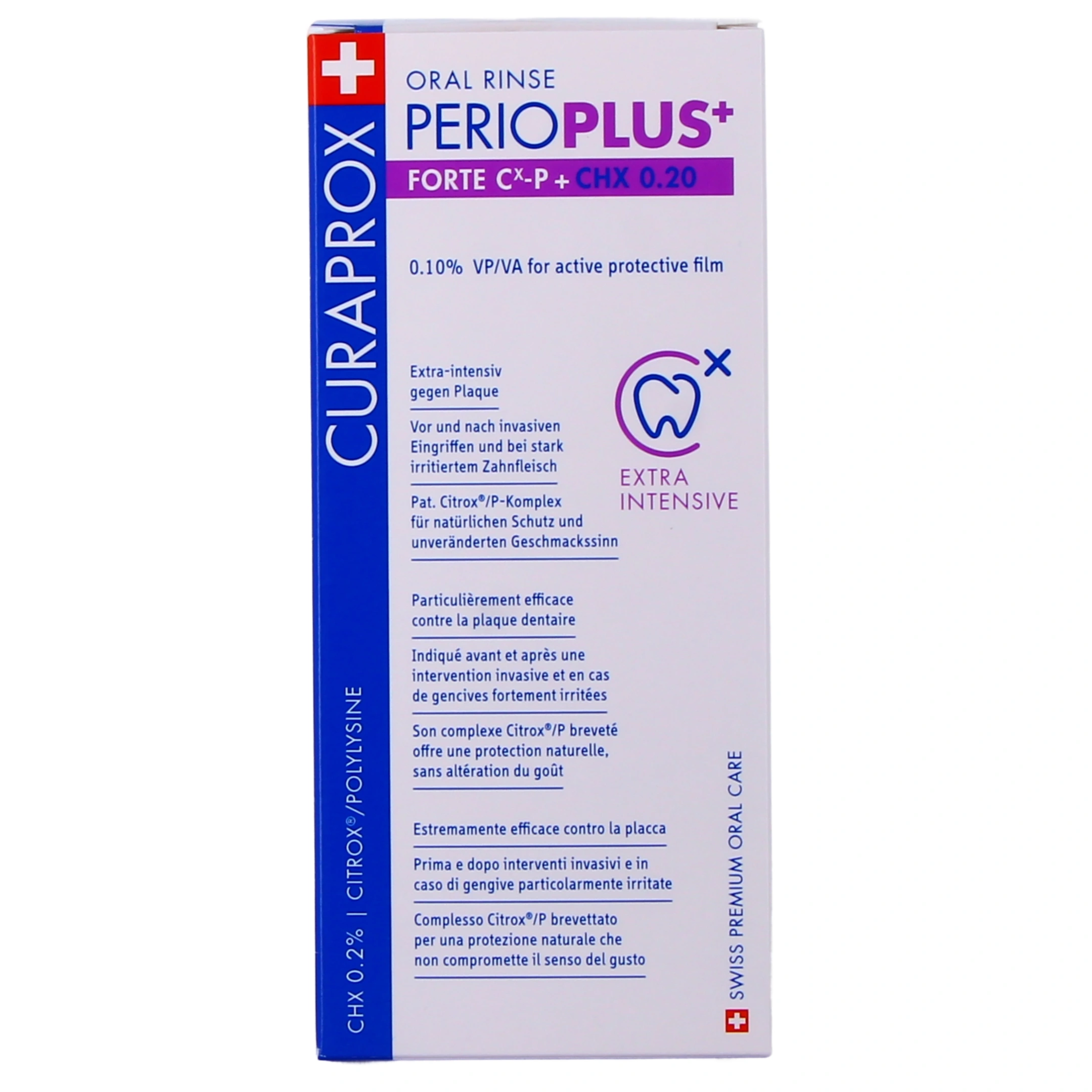 Le bain de bouche Curaprox Perio Plus+ Forte est un rince-bouche extrêmement puissant, conçu pour une utilisation à court terme. Il offre une protection antibactérienne maximale avant et après des interventions dentaires invasives ou en cas de gencives fortement irritées. Sa formule associe 0,2% de chlorhexidine au complexe naturel Citrox®/P pour un contrôle intensif de la plaque dentaire sans altération du goût.