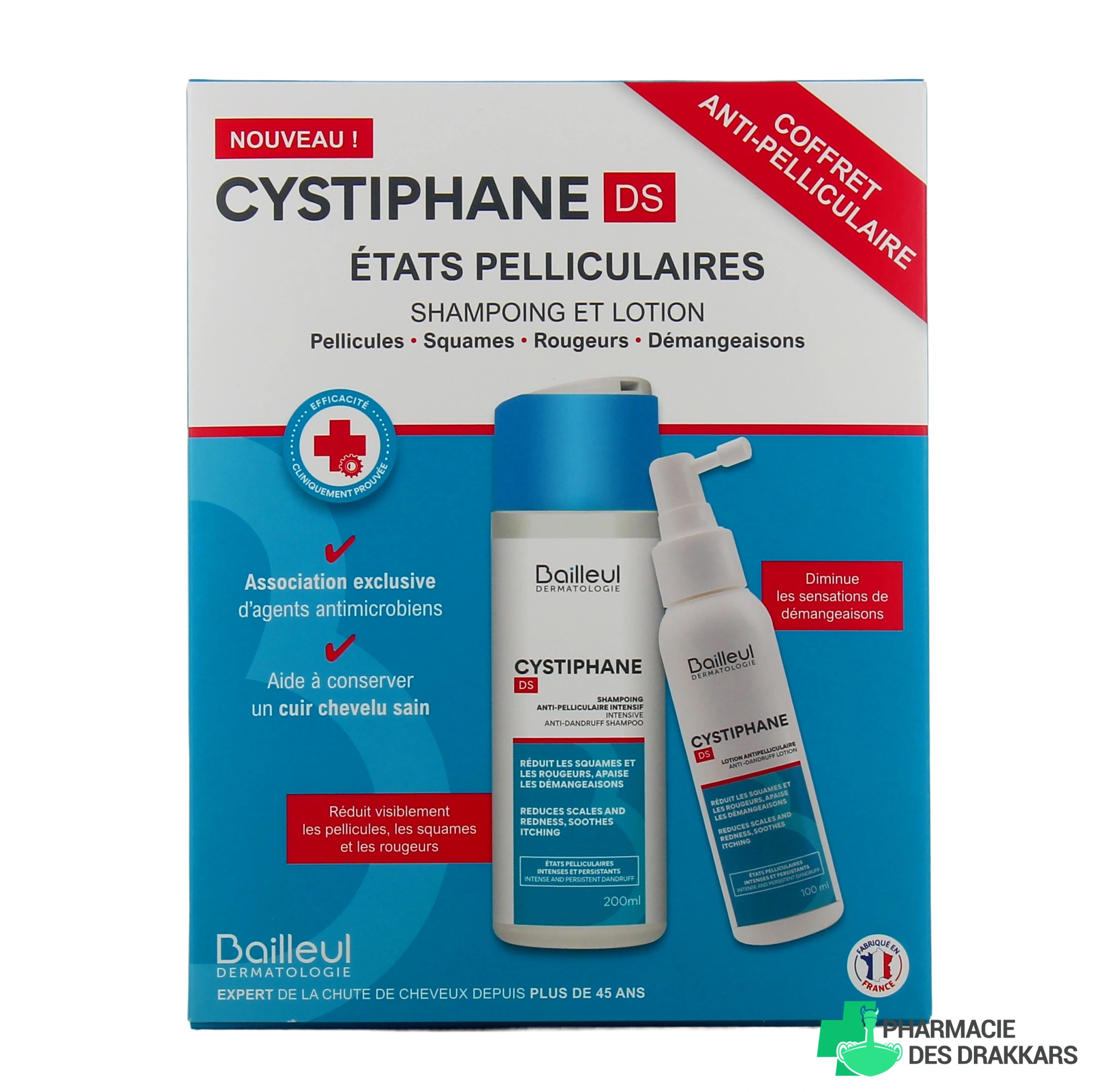 Vous pourrez retrouver le shampooing anti-pelliculaire intensif Cystiphane DS des laboratoires Bailleul dans les présentations suivantes chez Pharmacie des Drakkars : flacon de 200 ml.